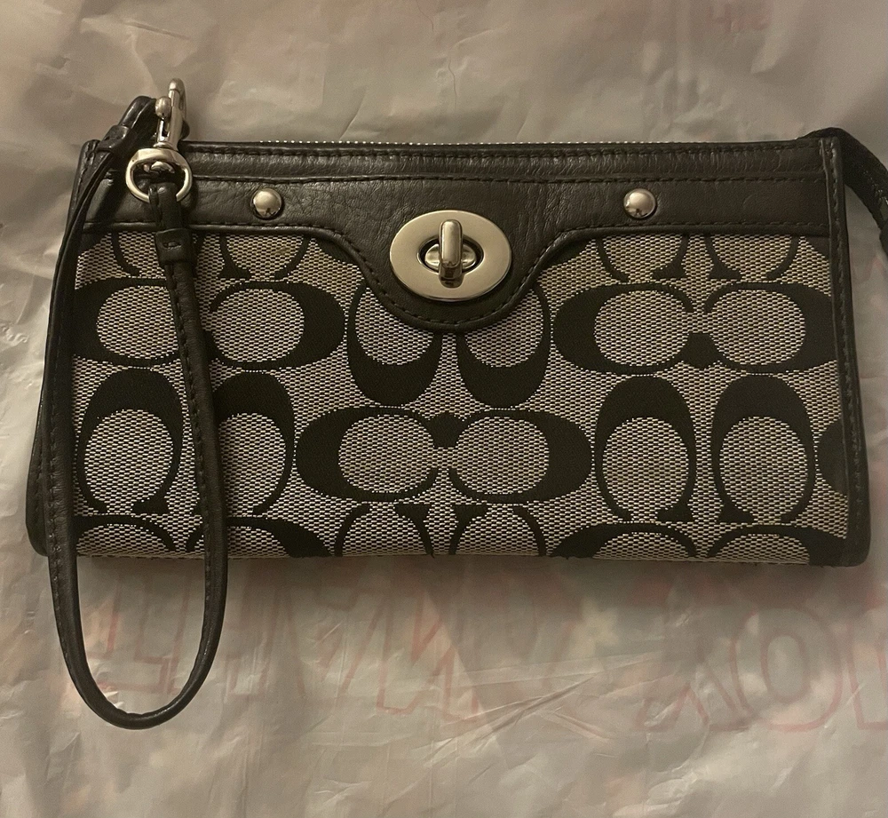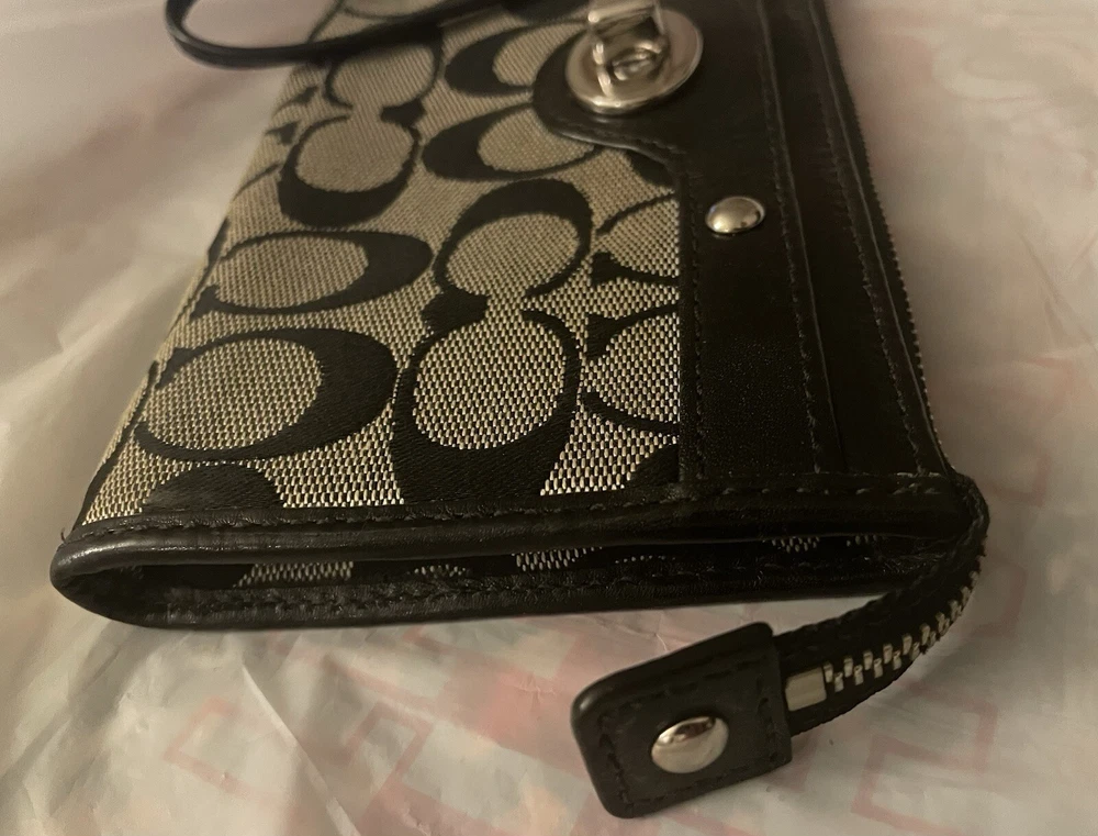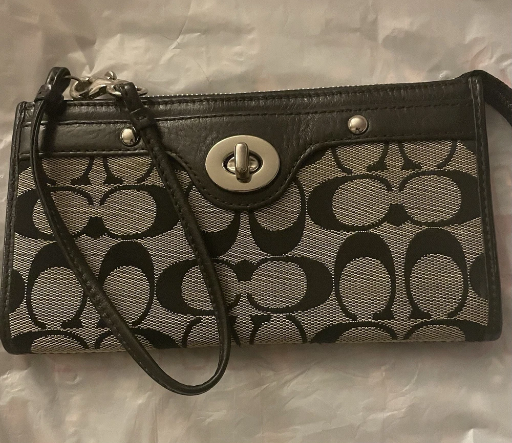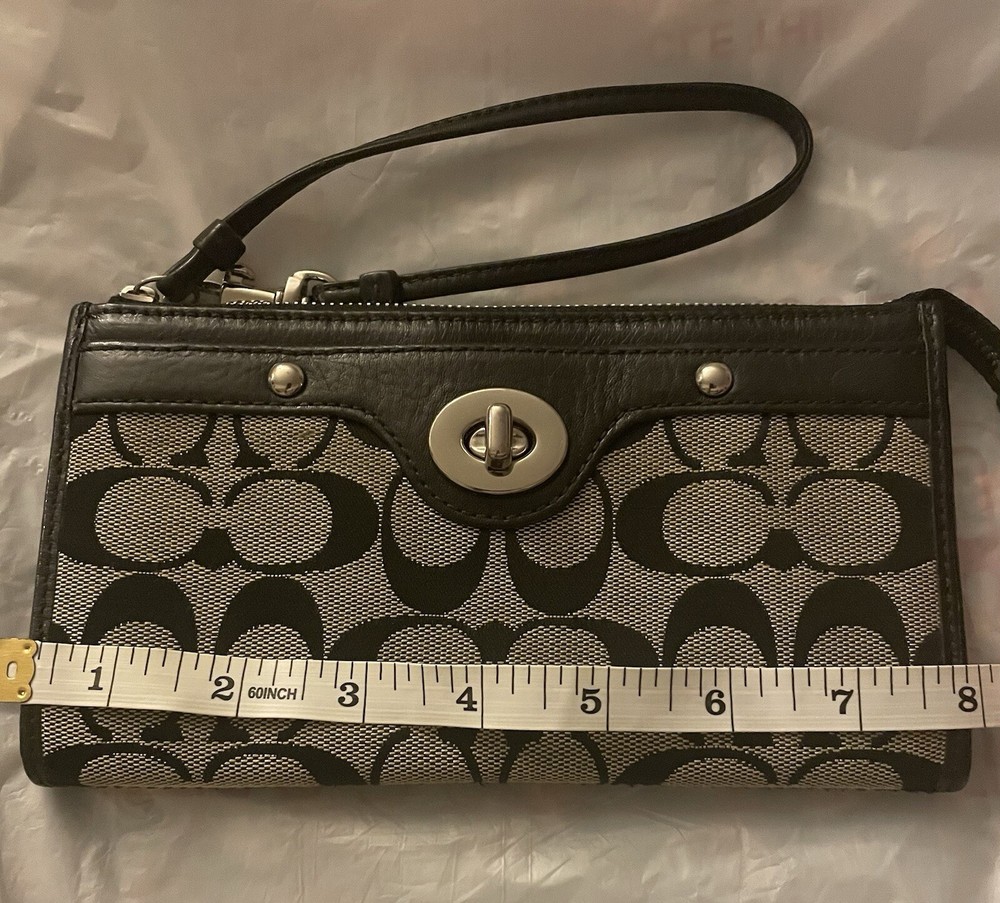 This Coach Penelope Zippy Turnlock Signature Wristlet Wallet is a stylish and functional accessory for women. Made of black leather with a solid pattern and signature character, this wallet features a strap and zipper accents. It is a large size, measuring 8 inches in width and 4 inches in length, and has credit card and folding features. The wallet is in great shape, looking like new. It is perfect for those who want a sophisticated and practical wallet to keep their essentials organized. Whether you're running errands or going out for a night on the town, this Coach wristlet wallet is a must-have accessory.