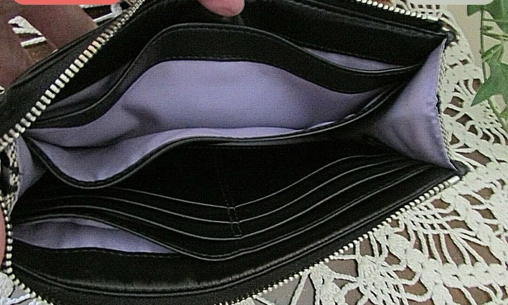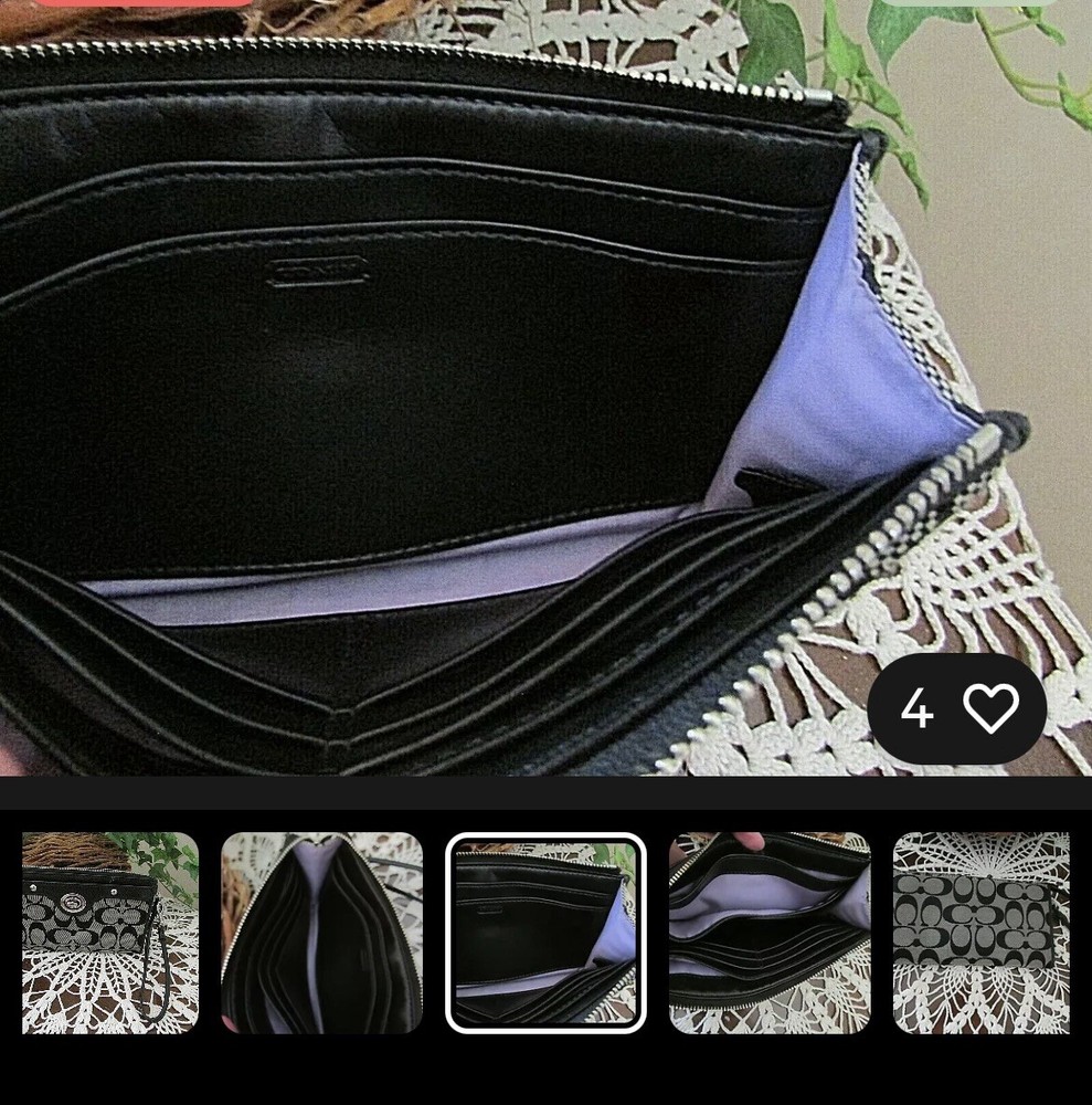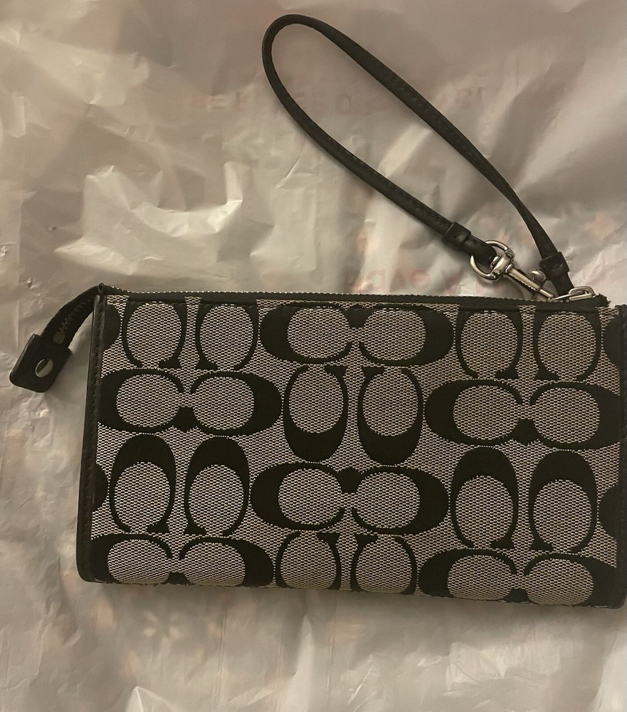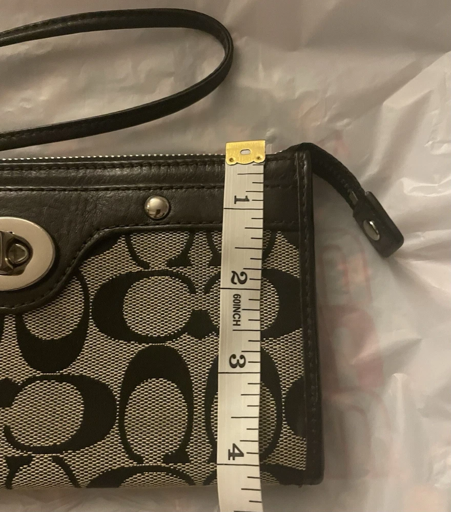 This Coach Penelope Zippy Turnlock Signature Wristlet Wallet is a stylish and functional accessory for women. Made of black leather with a solid pattern and signature character, this wallet features a strap and zipper accents. It is a large size, measuring 8 inches in width and 4 inches in length, and has credit card and folding features. The wallet is in great shape, looking like new. It is perfect for those who want a sophisticated and practical wallet to keep their essentials organized. Whether you're running errands or going out for a night on the town, this Coach wristlet wallet is a must-have accessory.