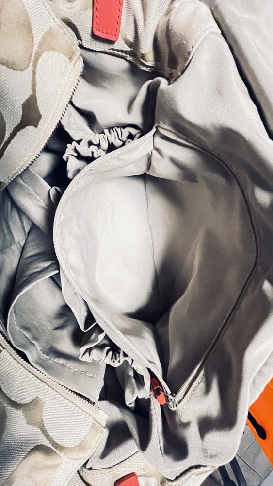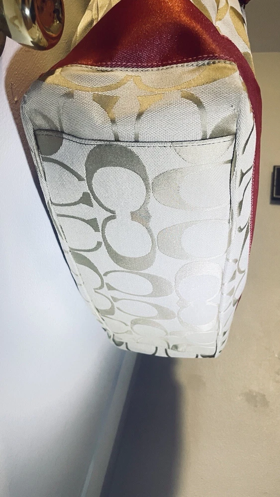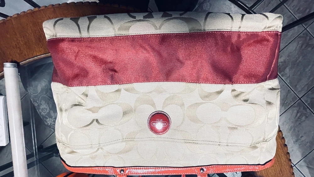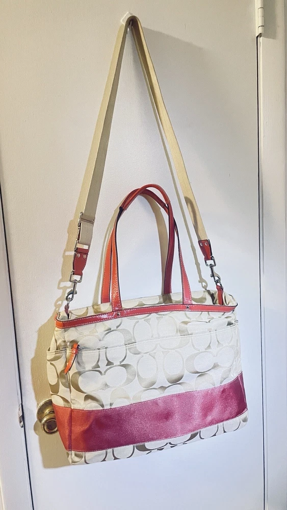 Like New and Excellent Condition! Coach Sateen shoulder bag is a stylish and versatile accessory for any woman. With a bright pink exterior and ivory lining, it features a zip closure and double handles with an 8-inch drop. The bag has a large size of 18 inches in width, 12 inches in height, and 6 inches in depth, making it perfect for travel, casual outings, or business meetings. Very clean inside and out. Used one time. No stains rips or tears. The bag also has a vintage feel with a logo pattern and silver and gold hardware. It includes several features such as a bottle pocket, inner pockets, and an adjustable strap. The nylon lining material and satin exterior material ensure durability and elegance. This Coach Sateen shoulder bag is a must-have for any fashion-conscious woman.
