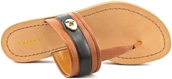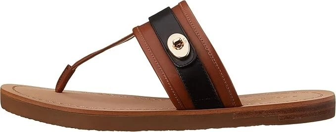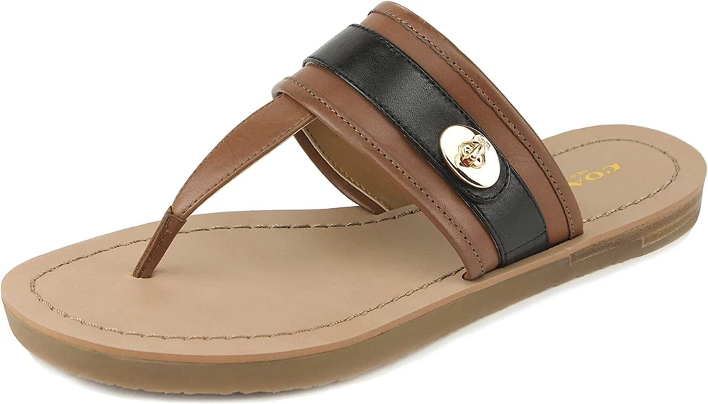 Coach Women's Eileen Sandal, Saddle/Black, 6.5 M US Authentic Guaranteed The Eileen Sandal from COACH blend water-resistance and warm-weather style for a beach-ready go-to. 3/4" heel Rubber sole Leather upper; sole: rubber Wipe clean Imported