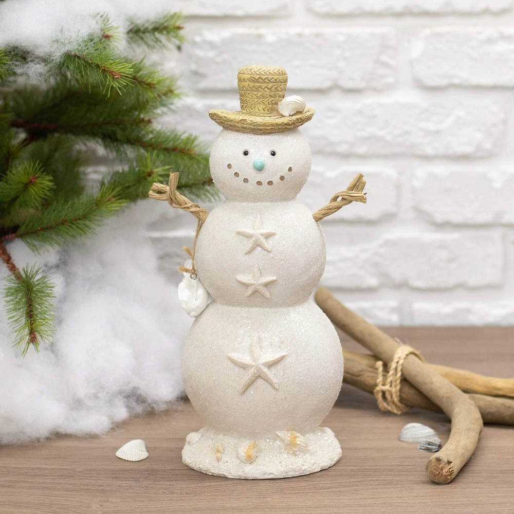 Coastal Sandman Snowman Figurine Coastal Snowman Holiday Figurine features a snowman with nautical details like seashells and starfish Made of a quality resin stone material with winter white finish Measures approximately 5.75 X 4.75 X 12 inches; Charming home accent Perfect atop a shelf or nestled on a mantel; Adding interest to any space in your home Contained in protective packaging; Ready for easy gifting