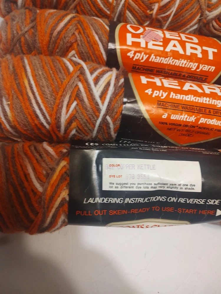 This lot of Red Heart Yarn comes with 6 skeins of 942 Copper Kettle Orlon/Acrylic fiber content, perfect for your knitting or crocheting needs. The vintage style and medium/worsted weight make it a versatile addition to your yarn collection. The brand, Coats & Clark, is known for their high-quality and durable yarns, making this lot a reliable choice for your crafting projects. The color is a beautiful Copper Kettle, sure to add a touch of warmth to any project. 5 skeins are new one is used but still weighs 2.15 ounces. Combined shipping available if items are purchased together at the same time. Thanks for looking.