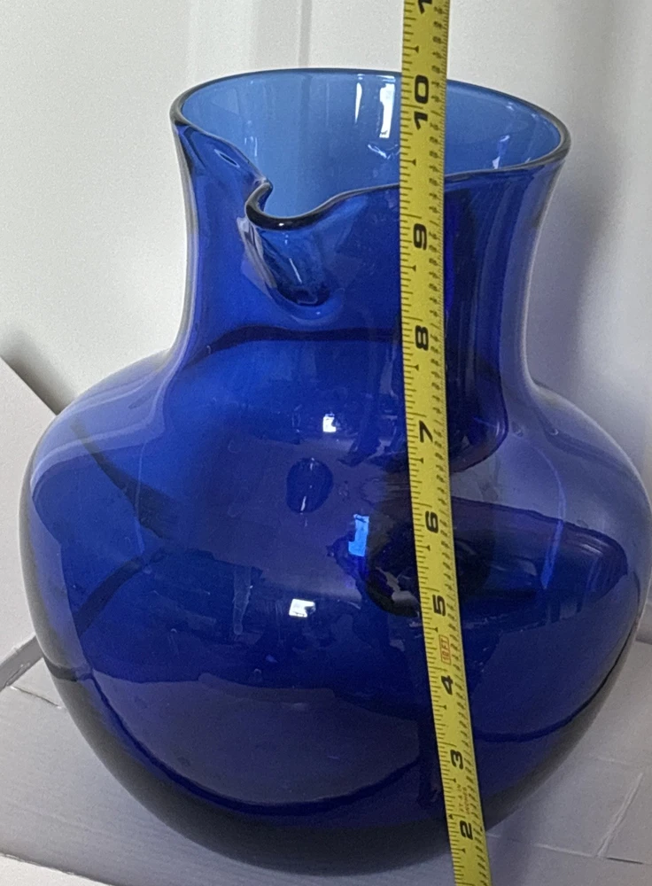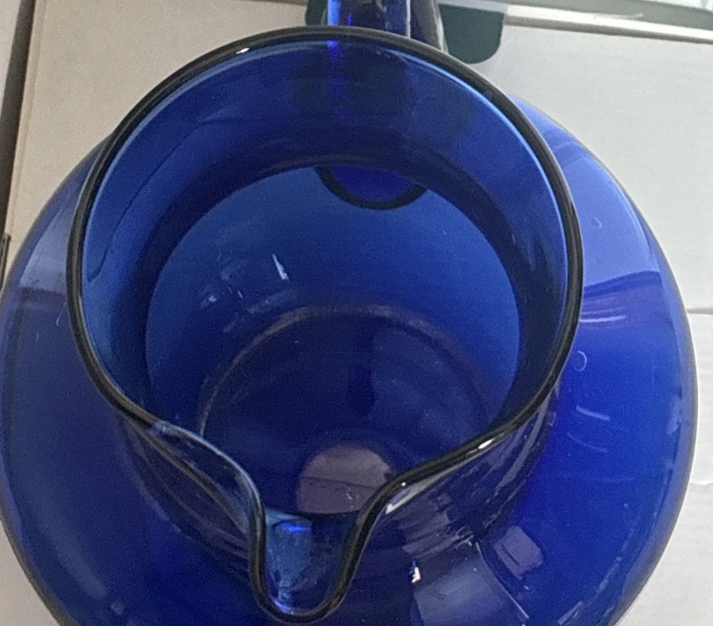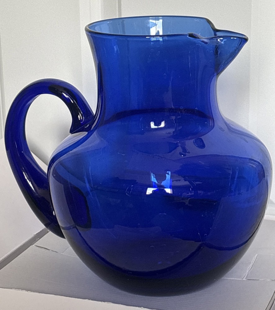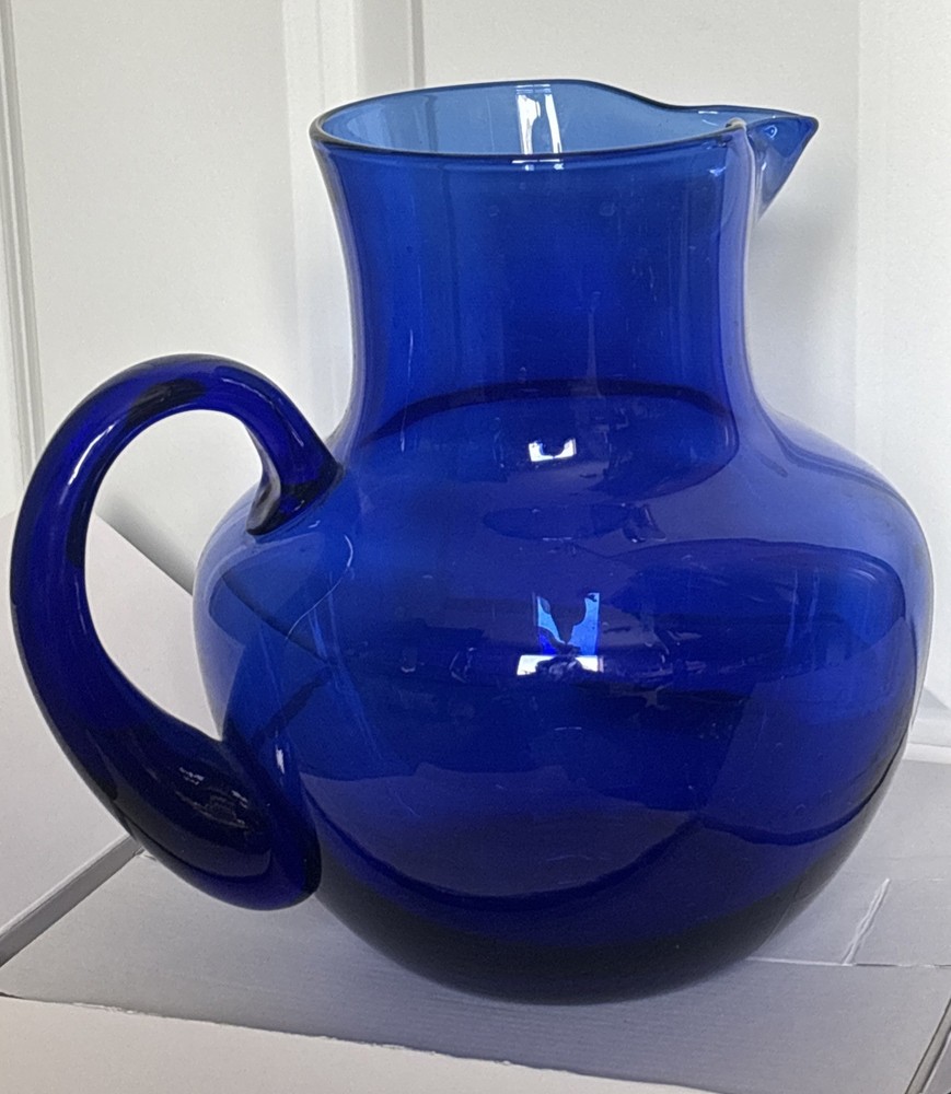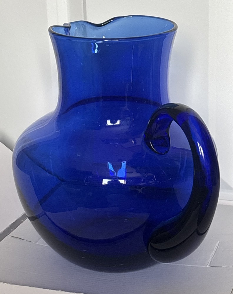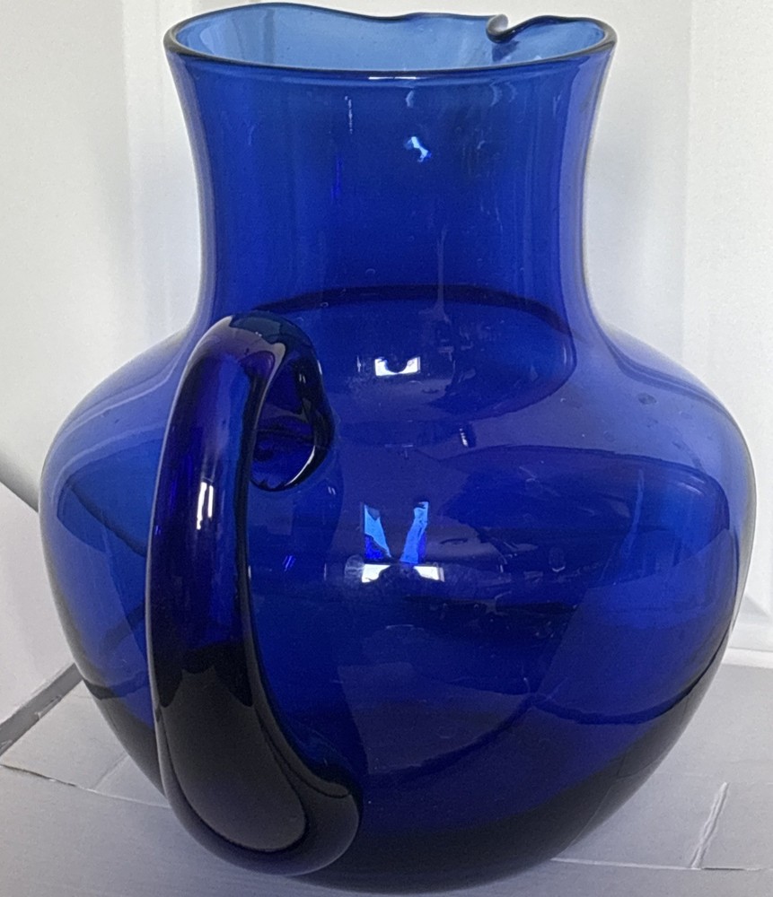Beautiful cobalt blue pitcher with handle. See photos for size and details. Reach out with questions. Thank you!