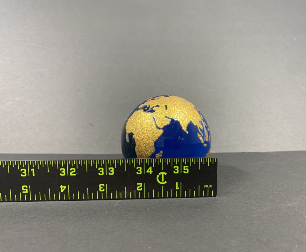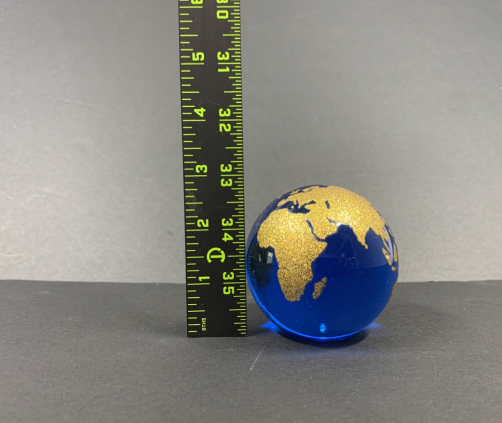 Experience the elegance of an artful desk accessory with the Cobalt World Globe Paperweight. This round glass sculpture captures the essence of the Earth with its vivid blue hue and detailed gold continents, offering a touch of sophistication to any workspace or display shelf. Crafted from quality glass with an art glass production style, the globe's brand remains unmarked, emphasizing its unique and artisanal charm. The paperweight's theme of Earth provides a thoughtful nod to our planet's beauty and the mystery of its origins, making it an ideal gift or collector's item for enthusiasts of globe decor and art glass aficionados alike. Please look at pictures for condition of item. Will not ship to Alaska or Hawaii and Puerto Rico If there is a problem please reach out to me to resolve any problems. Thank you for the order and I look forward to doing business.