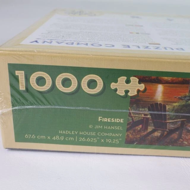 This 1000-piece Cobble Hill puzzle features the serene artwork "Fireside" by Jim Hansel. The puzzle measures 26.625" x 19.25". Sealed and in good condition.