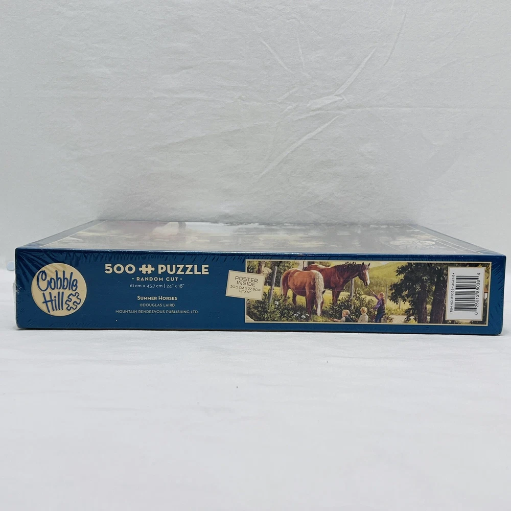 Cobble Hill used puzzle. Summer Horses. Poster included. There is a bend in one corner of box. See pictures for details. Also there is writing on the back of the box. This is also seen in pictures.