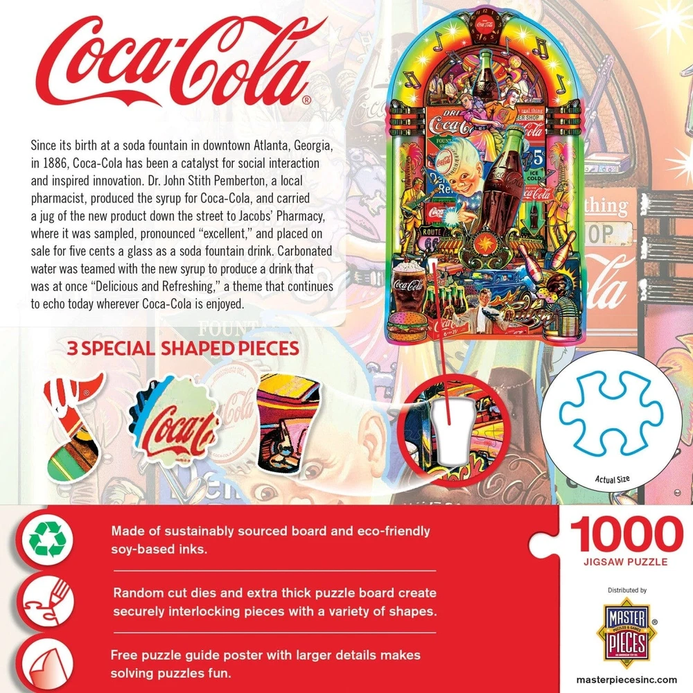 This 1000pc Coke shaped puzzle. Join in the dancing at the corner diner with this nostalgic Coke Jukebox playing all your favorites from the good old days. Includes three special shaped pieces hand-drawn into the dieline. To reduce their impact on our environment, the chipboard used in these puzzles is made of 100% recycled material. Coca-Cola Jukebox 1000 Piece Shaped Jigsaw Puzzle Recycled Material Retro Design This 1000pc Coke shaped puzzle. Join in the dancing at the corner diner with this nostalgic Coke Jukebox playing all your favorites from the good old days. Includes three special shaped pieces hand-drawn into the dieline. To reduce their impact on our environment, the chipboard used in these puzzles is made of 100% recycled material. Product Attributes: Weight (lbs.) : 1.00 lb UPC: 705988722868 Brand: MasterPieces