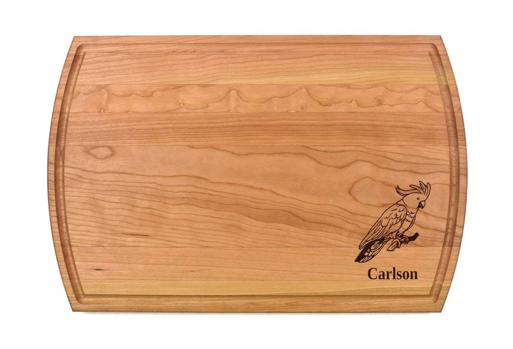 Design: Personalized Cockatoo Parrot Bird Cutting Board or Charcuterie Serving Tray All items ship via USPS - please make sure your address is correct :-) Whether used as a charcuterie serving tray for snacks or cutting board, our bamboo, walnut and cherry custom boards are the perfect addition for the home and make the perfect gift for your loved one celebrating a birthday, anniversary, new home, wedding, etc! *** FEATURES *** • SIZES: We have multiple styles and sizes available. To see our current sizes available, click the drop-down menu. The photo slide contains a photo showing each side by side. Please note, the board with the juice groove only has the groove on the front side of the board. • THICKNESS: Bamboo Boards - Approximately 1/2" Thick; Walnut & Cherry Boards - Approximately 3/4” Thick • UNIQUE: Every board is unique with the grain and coloring varying throughout - no board is the same! • CARE INSTRUCTIONS: Hand wash only with warm water. Do not soak. Please apply mineral oil throughout the board’s life. • PERSONALIZATION/CUSTIMIZATION: Do you want the text placed differently on the board? Please don’t hesitate to contact us. All personalization notes can be entered in the personalization box when checking out. • SHIPPING: All cutting boards ship within 2 to 5 business days. • WHOLESALE ORDERS: Please don’t hesitate to contact us for information about wholesale orders. Processing times for larger orders may change. • NOTE: Colors can vary a bit on different monitors and screens. Any props included in photos are not included. Please be sure to double-check your address to make sure it is accurate for USPS delivery. If a package is returned to us due to an invalid address, the buyer is responsible for all additional shipping charges. We appreciate you supporting small business – best wishes! For items ordered with simple edits, we do not send proofs since the layout doesn't change from the example(s). However, in the event there are requests that change the layout from the example(s), we do send proofs for approval before making the product. If you'd like a proof before we make the product, please note so in the personalization box.