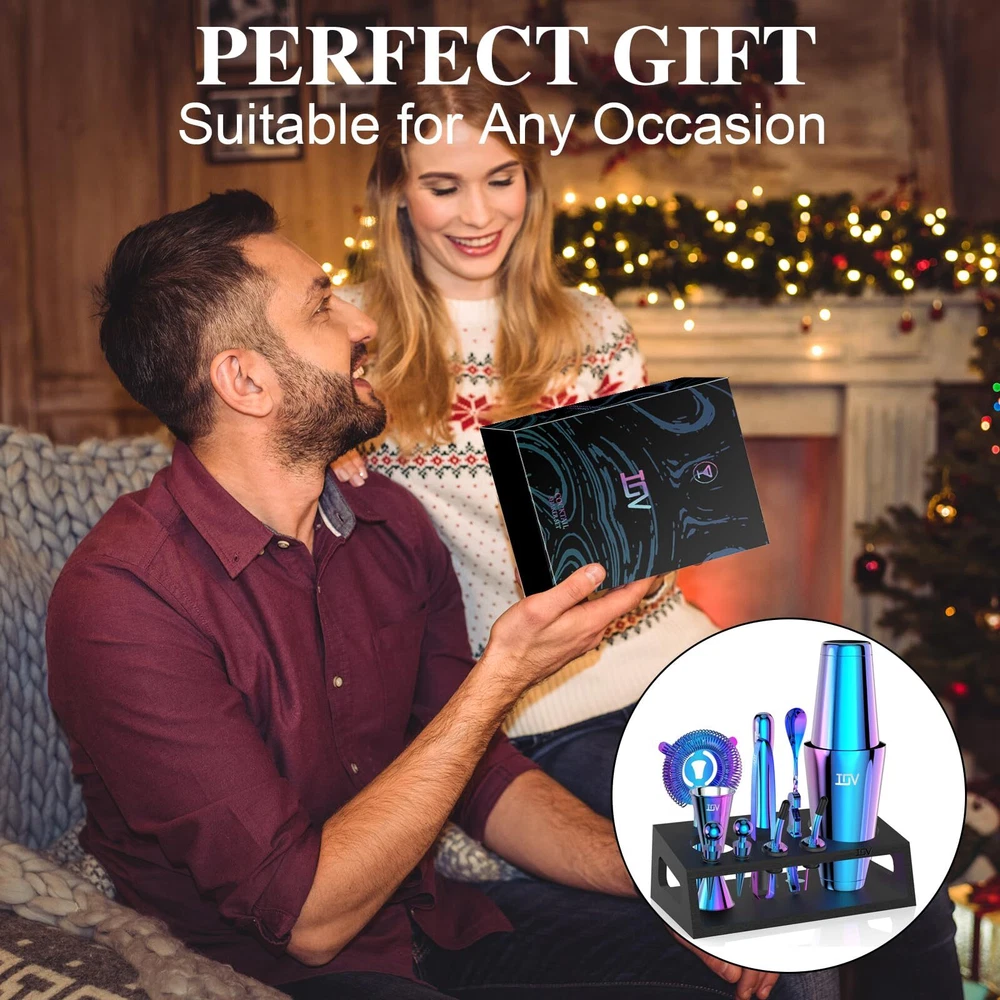 Vibrant Muddler for Cocktails: Igniting your obsession for vibrance! , a brand known for its vibrant colors, has meticulously crafted this 12-piece cocktail shaker set specifically for cocktail enthusiasts. The colorful, modern design adds a lively touch to your home bar, making it anything but dull. All in One Bartender Kit: Includes a professional 18oz & 28oz Boston Shaker, muddler, mixing spoon, strainer, jigger, bottle opener, 2 pourers, 2 bottle stoppers, ice tongs, a black bamboo stand, and a recipe booklet featuring 28 cocktail recipes. This kit provides all the tools you need for mixing drinks. Eye-Catching Display: The bamboo rack keeps your bar tools organized, easily accessible, and beautifully showcased. With cutout handles on both sides, it’s easy to use and move. Whether you’re a beginner mixologist or a professional bartender, displaying your exquisite cocktail set with this unique bamboo storage rack is sure to capture your guests’ attention. Built to Last: This cocktail shaker is made from high-quality, rust-resistant, food-grade stainless steel, ensuring it keeps its shine for years. The drink mixer is durable enough to withstand rough handling and even drops. Plus, the bar set is dishwasher-safe for easy cleaning. Perfect Gift: Whether you’re a bartender searching for a high-quality cocktail shaker set or a home mixologist looking to start crafting and serving drinks in your entertainment space, this couples’ cocktail set is a great gift for everyone. Even if you’ve never mixed cocktails before, it provides plenty of inspiration. It’s a thoughtful gift for friends, family, colleagues, clients, and business partners, showcasing your taste.