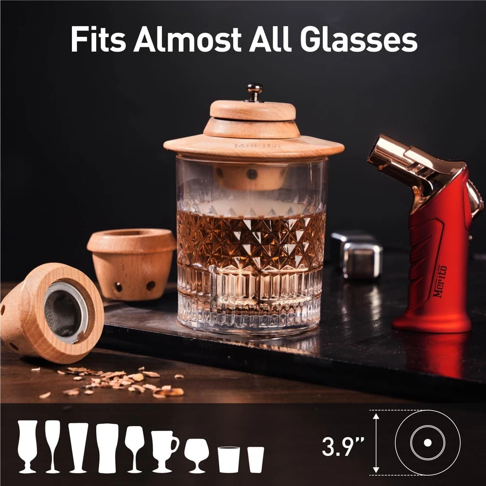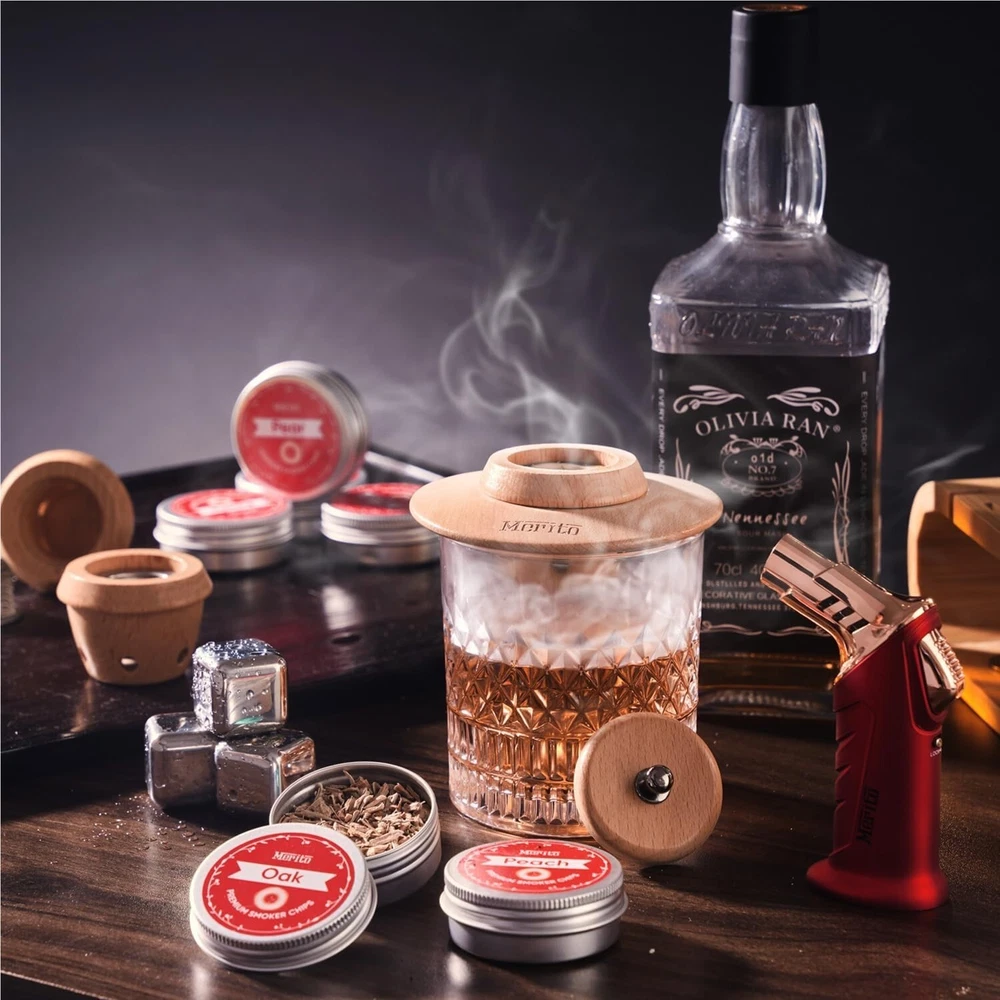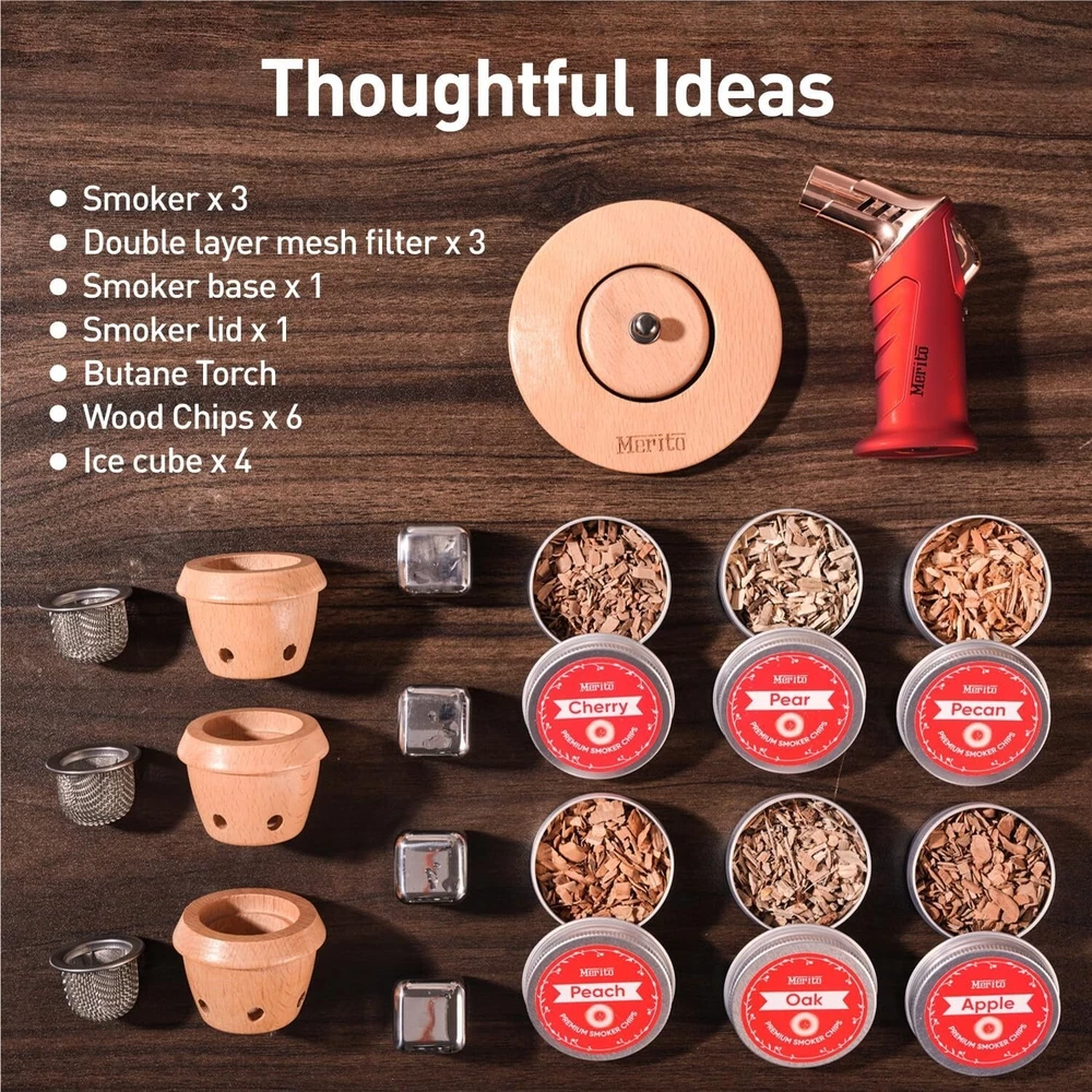 About this item đ ăTriple the LifespanăThe Merito cocktail smoker kit features a unique, patent-pending design with a detachable base and three smokers. If the smoker becomes clogged or damaged over time, simply replace it, extending the set's life to three times longer than general cocktail smokers. It's the perfect choice for those who enjoy long-lasting performance đ ăComplete Your NeedsăThis all-in-one whiskey smoker kit includes everything you need: one smoker, three adapters, three filters, six boxes of wood chips, a butane torch, and four stainless steel ice cubes. Get ready to elevate your cocktail experience with all the essentials for a perfect smoking session đ ăElegant GiftăOur Merito drink smoker kit comes in a beautifully designed, double-layered box that delivers a stunning visual presentation upon opening. It's the ultimate gift for Christmas, Father's Day, Valentine's Day, birthdays, and more â guaranteed to surprise and delight anyone who receives it đ ăWide ApplicationăWith our smoker, you can infuse various flavors into your favorite cocktails, whiskeys, bourbons, and foods like meats, cheeses, and BBQ. Create a personalized taste experience for any occasion, indoors or outdoors, and impress your guests with a unique smoking twist! đ ăPerfectly SizedăOur whiskey smoker's cone-shaped base fits various glass sizes, including rocks glasses, Glencairn glasses, double old-fashioned glasses, and pint glasses. Enjoy perfectly smoked drinks with optimal performance and speed, making every drink a masterpiece Included Components 1 natural oak smoker with lid to help infuse the flavors into the drink; 3 filters for a long-life use; 1 professional food grade torch; 6 cans with selected natural wood chips, 3 stainless steel filters with the best cocktails to smoke 4 stainless steel ice cubes. The bar kit is in the MeritoÂź Designer Box Case