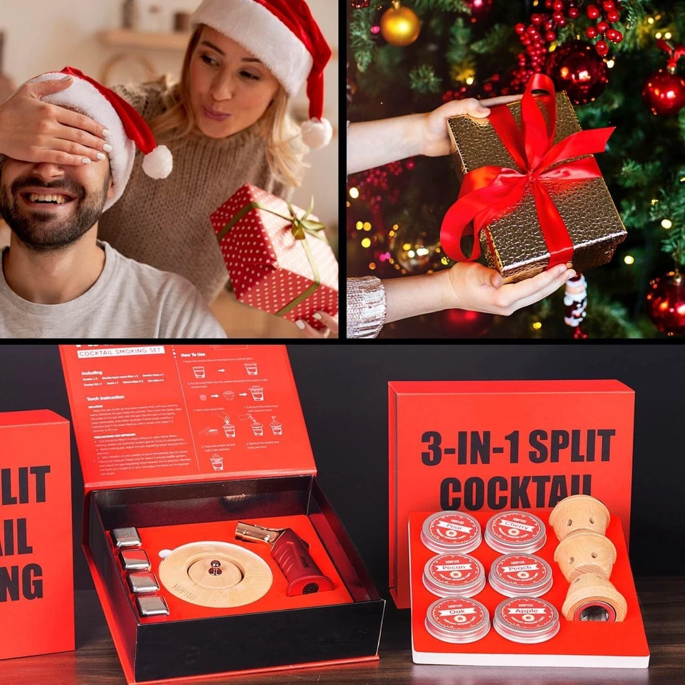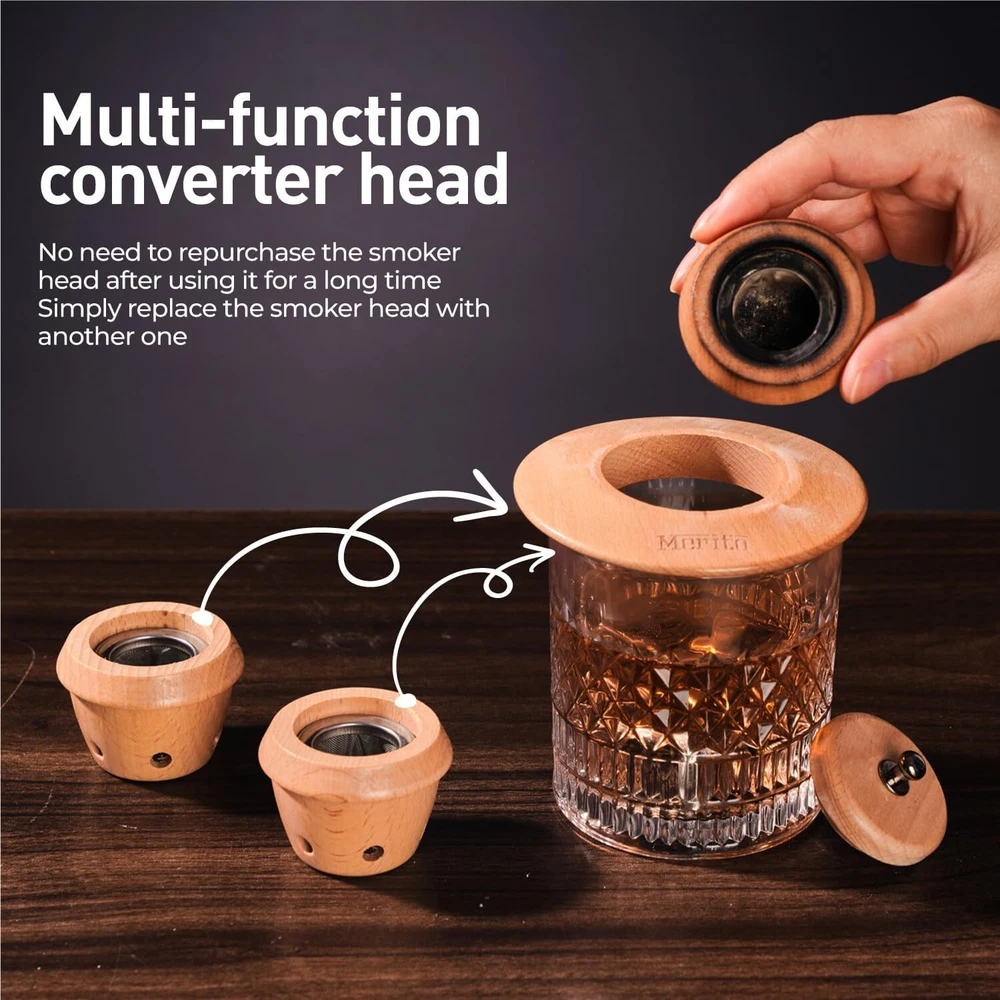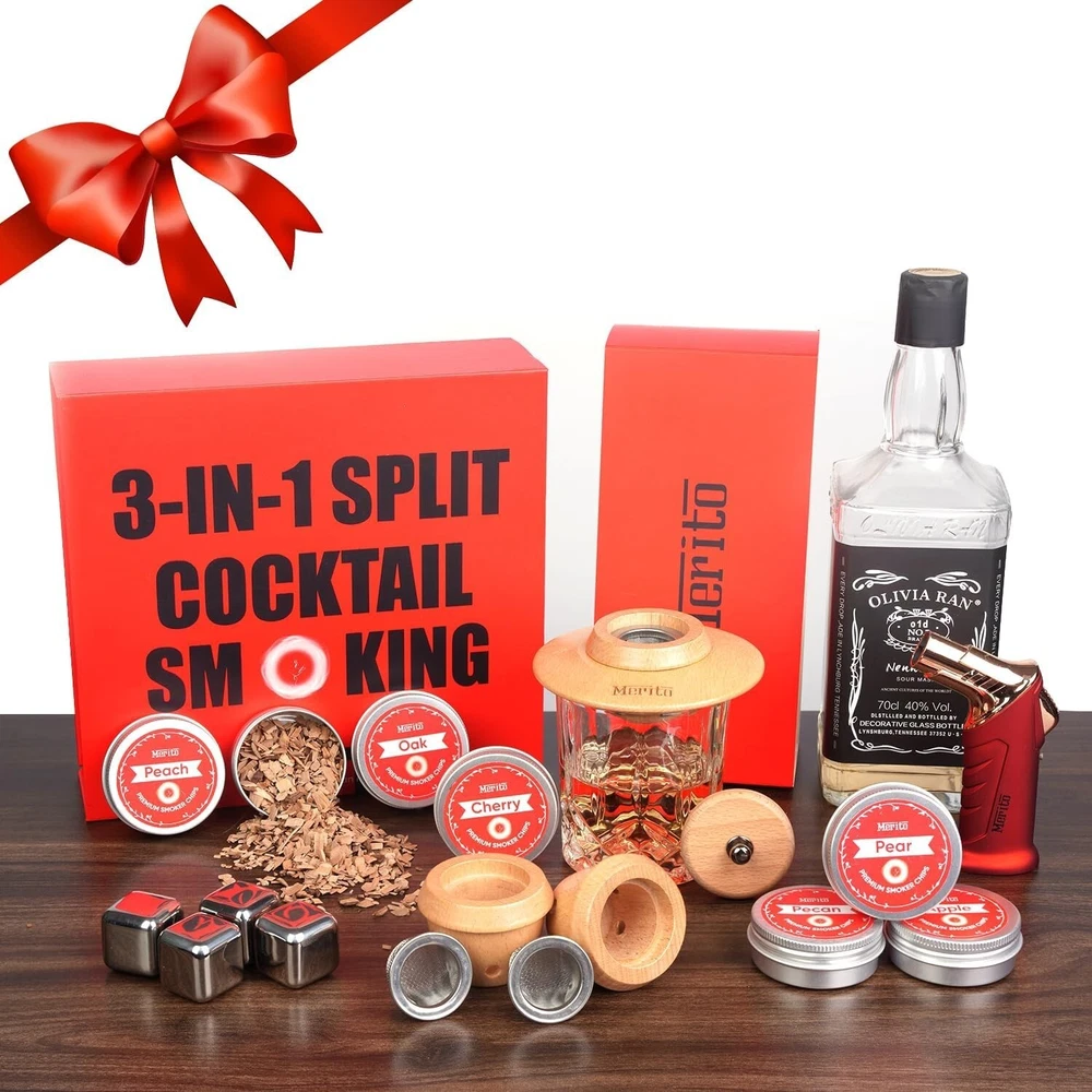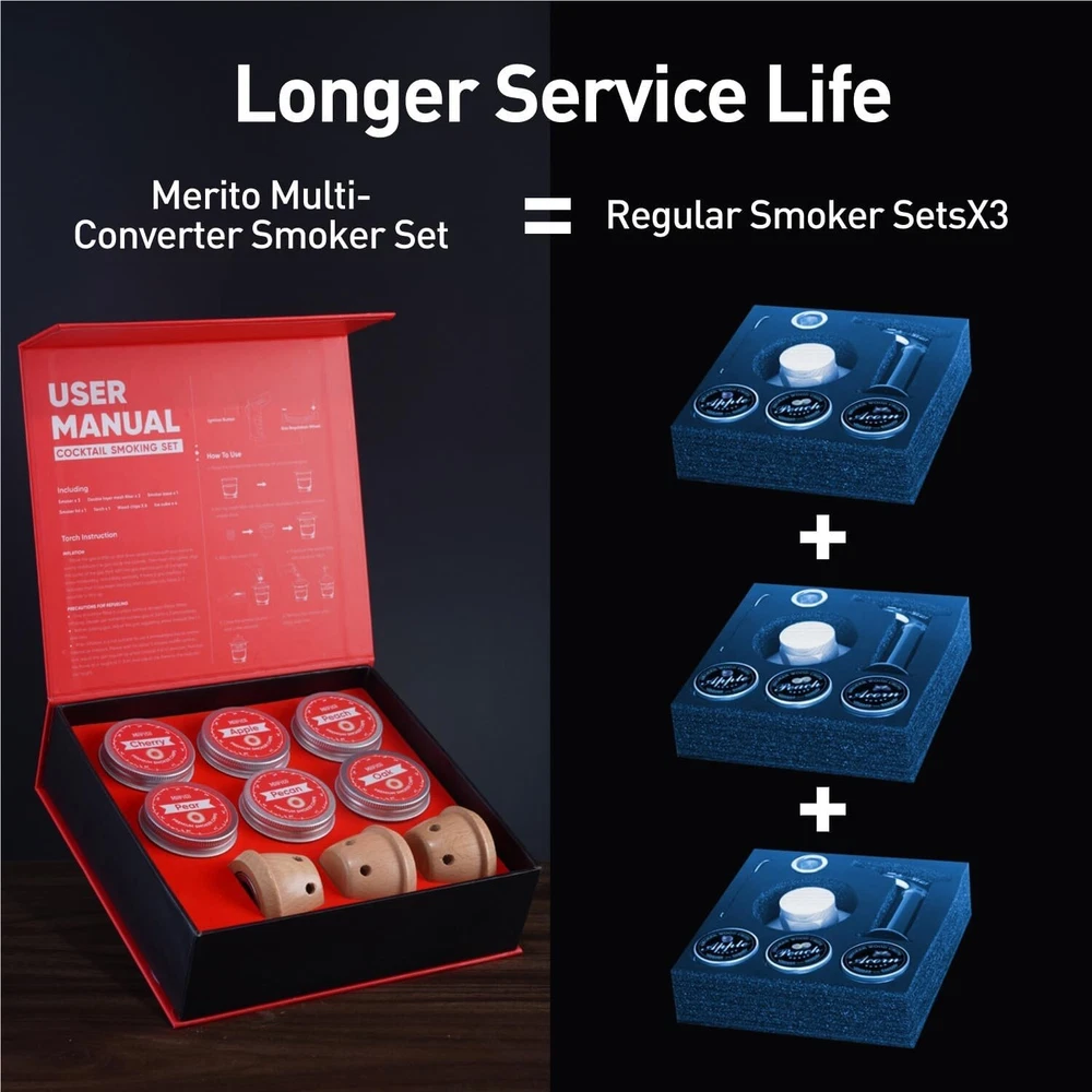 About this item đ ăTriple the LifespanăThe Merito cocktail smoker kit features a unique, patent-pending design with a detachable base and three smokers. If the smoker becomes clogged or damaged over time, simply replace it, extending the set's life to three times longer than general cocktail smokers. It's the perfect choice for those who enjoy long-lasting performance đ ăComplete Your NeedsăThis all-in-one whiskey smoker kit includes everything you need: one smoker, three adapters, three filters, six boxes of wood chips, a butane torch, and four stainless steel ice cubes. Get ready to elevate your cocktail experience with all the essentials for a perfect smoking session đ ăElegant GiftăOur Merito drink smoker kit comes in a beautifully designed, double-layered box that delivers a stunning visual presentation upon opening. It's the ultimate gift for Christmas, Father's Day, Valentine's Day, birthdays, and more â guaranteed to surprise and delight anyone who receives it đ ăWide ApplicationăWith our smoker, you can infuse various flavors into your favorite cocktails, whiskeys, bourbons, and foods like meats, cheeses, and BBQ. Create a personalized taste experience for any occasion, indoors or outdoors, and impress your guests with a unique smoking twist! đ ăPerfectly SizedăOur whiskey smoker's cone-shaped base fits various glass sizes, including rocks glasses, Glencairn glasses, double old-fashioned glasses, and pint glasses. Enjoy perfectly smoked drinks with optimal performance and speed, making every drink a masterpiece Included Components 1 natural oak smoker with lid to help infuse the flavors into the drink; 3 filters for a long-life use; 1 professional food grade torch; 6 cans with selected natural wood chips, 3 stainless steel filters with the best cocktails to smoke 4 stainless steel ice cubes. The bar kit is in the MeritoÂź Designer Box Case
