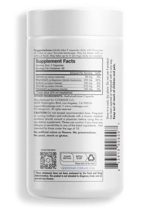 About This Item We aim to show you accurate product information. Manufacturers, suppliers and others provide what you see here, and we have not verified it. Codeage Keto Electrolytes Minerals Formula Supplement Codeage Keto Electrolytes capsules helps to improve mood, and facilitates better muscle function through replenishing the bodys supply of essential electrolytes including Sodium, Magnesium, Potassium and Calciun, in particular on a low carb or ketogenic diet. Proper electrolyte balance may be the most important element required to sustain a low carb or keto lifestyle in the long term. Unlike other hydration electrolyte tablets, electrolyte packets, electrolytes powder, electrolyte drops, electrolyte pills, electrolyte drinks, organic electrolytes, liquid electrolytes, electrolyte mix and keto electrolyte tablets, our Electrolyte Supplement works quickly and effectively*. Keto Electrolytes Formula All-In-One ? Sodium, potassium, magnesium, and calcium all-in-one ? Pure with zero carbs, calories, or fillers ? Vegan ? Non-GMO ? Dairy, soy, and gluten free ? 3 months supply Manufactured in the USA in a cGMP certified facility Essential Minerals Electrolytes: Codeage Keto Electrolytes capsules feature Magnesium, Calcium, Sodium, and Potassium All-in-One. These minerals electrolytes can be found in many parts of our body including our bones, muscles and soft tissues.* Formulated for Sports Nutrition, Ketogenic Diet & Low-Carb Diet: This Electrolytes supplement comes in a capsule format and are designed as both Keto pills for men and women. 3 Months Supply: Codeage Keto Electrolytes supplement offers 180 capsules in each bottle for 3 Months Serving of Electrolytes. Vegan, Non-GMO & Manufactured in the USA: Codeage Keto Electrolytes capsule supplement is Dairy & Gluten Free. This keto diet formula is manufactured in the USA in a cGMP Certified Facility and Third Party Tested. Indications: Stop Use Indications: *These statements have not been evaluated by the Food and Drug Administration. This product is not intended to diagnose, treat, cure or prevent any disease, and is intended for healthy adults, 18 years of age or older. Do not take this product if you are pregnant or nursing. Consult your physician prior to use if you are taking any medication or have any medical conditions. Actual product packaging and materials may contain more and different information than what is shown on our website. We recommend that you do not rely solely on the information presented and that you always read labels, warnings, and directions before using or consuming a product. Keep out reach of children. *These statements have not been evaluated by the Food and Drug Administration. This product is not intended to diagnose, treat, cure, or prevent any disease. Health Concern: Hydration Support Warnings: legal:*These statements have not been evaluated by the Food and Drug Administration. This product is not intended to diagnose, treat, cure or prevent any disease.,safety:Do not exceed recommended dose. Please use caution if you have allergies or sensitivities to any of the listed ingredients. Pregnant or nursing mothers and individuals with a known medical condition should consult a physician before using this or any dietary supplement. Use only as directed. Discontinue use immediately if you experience any adverse symptoms or reactions while taking this product. Keep out of reach of children and pets. Store in a cool, dry place, away from heat moisture. None Ingredients: Ingredients: Sodium, Magnesium, Potassium, Calcium Active Ingredients: Sodium, Magnesium, Potassium, Calcium Directions: Instructions: Adults take 1 capsule daily with 8 ounces of water or your favorite beverage. May be taken with or without food. May take up to 4 servings daily, as needed/ If supplementing with Vitamin D, take Keto Electrolytes at the same time for added absorption. Dosage: Adults take 1 capsule daily with 8 ounces of water or your favorite beverage. May be taken with or without food. May take up to 4 servings daily, as needed/ If supplementing with Vitamin D, take Keto Electrolytes at the same time for added absorption. Explore this item Specifications Supplement Facts Supplement Facts Adults take 1 capsule daily with 8 ounces of water or your favorite beverage. 180 Calcium (as Calcium Carbonate) 99 mg 8% Magnesium (as Magnesium Chloride Hexahydrate) 200 mg 48% Potassium (as Potassium Chloride) 100 mg 2% Sodium Chloride 350 mg ** Will be wrapped with care. ~ ~FREE SHIPPING~ Any questions, please feel free to contact us. Buy with confidence! Thanks for looking!