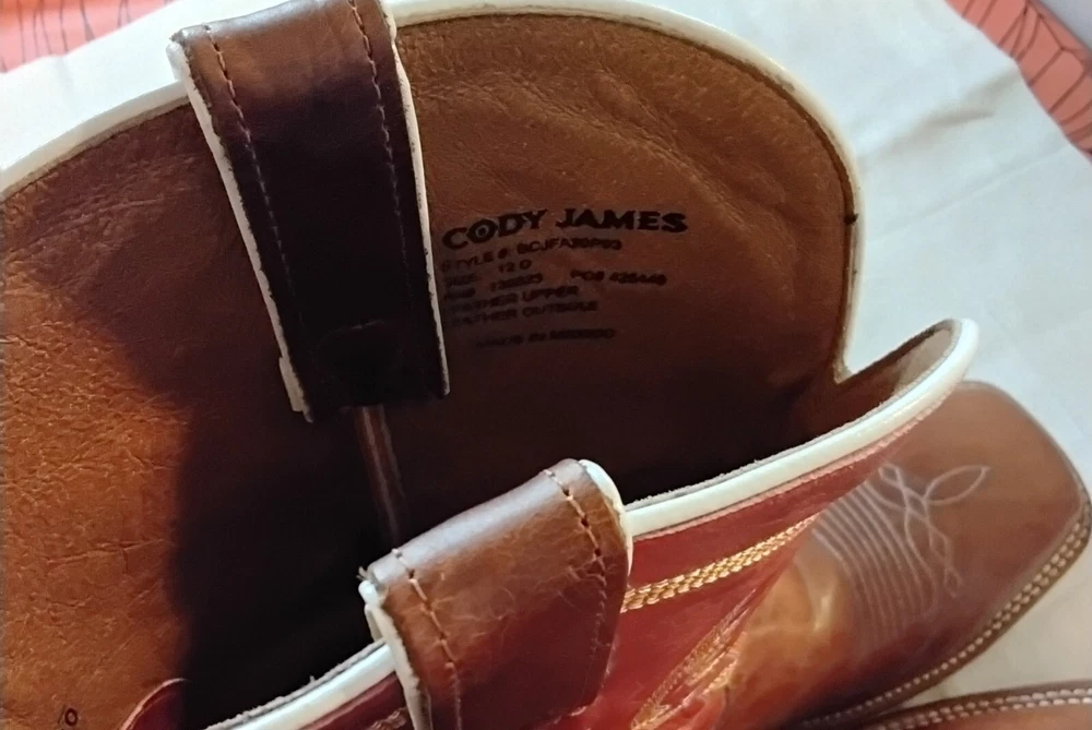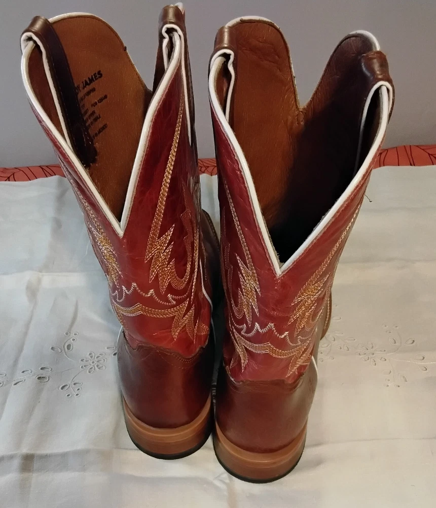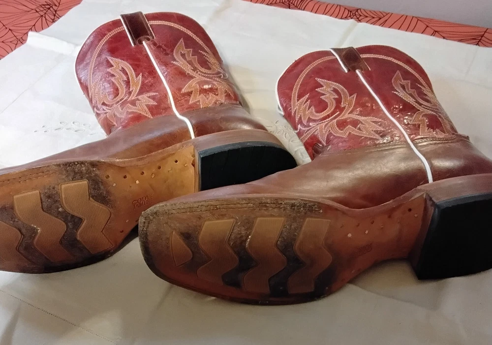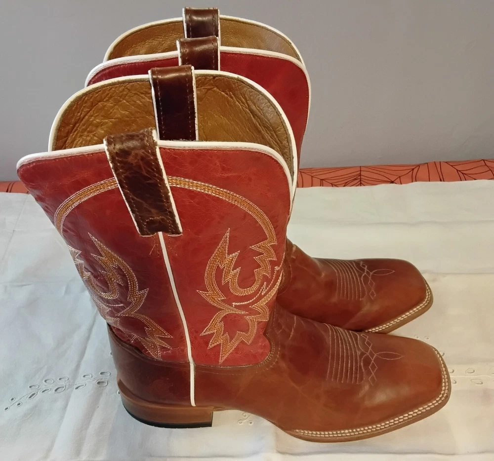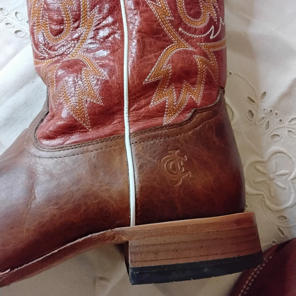 LIKE NEW CONDITION NO SCUFF ON TOE OR HEEL. THE SQUARE TOE GIVES ADD COMFORT. TOP IS Terricotta red with yellow gold stitch design bottom Portion is solid brown