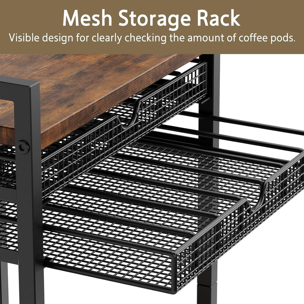 Coffee Bar Stand Station Cart, Coffee Pod Holder Drawer for 84 Coffee Pods Storage, Coffee Cart with Wheels, Stylish Home or Office Coffee Bar Station Organizer, Rustic Brown 【Coffee Pod Holder】coffee bar cart is not only practical,but also has a stylish design,adding a charm to your coffee corner station.The carefully selected combination of colors and materials complements a variety of coffee pots and coffee utensils,creating a high-quality coffee scene 【Sliding Drawer Design】You don't need to rummage through the whole coffee station drawer,you can easily access the coffee pods you need.Simple and convenient to operate,easy to push and pull.Whether it's a busy morning or a relaxing afternoon,you can quickly find the coffee pods you want and enjoy a delicious cup of coffee 【Sturdy & Durable】We focus on the quality and durability of our coffee cart,this coffee station organizer is made of metal bracket and MDF with good durability and stability,which can provide safe protection for your coffee pod for a long time 【Save Counter Space】The double layer k cup organizer measures 12.5"D x 17"W x 33.7"H,can hold up to 84 K cups,easily meet your daily coffee needs.The top can hold a coffee maker and the under can storage coffee accessories without taking up too much space,making your countertop space more neat and organized