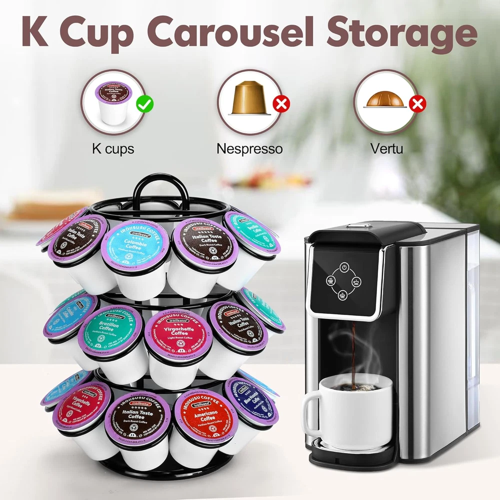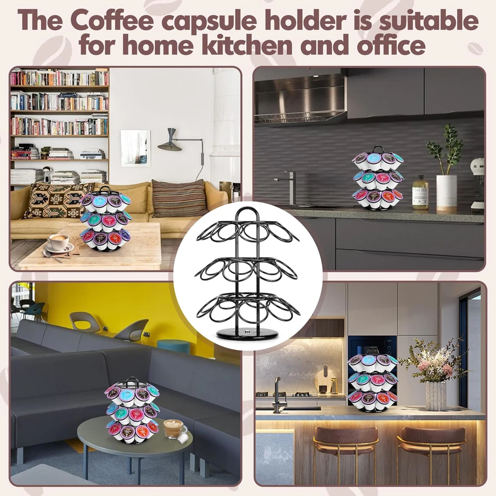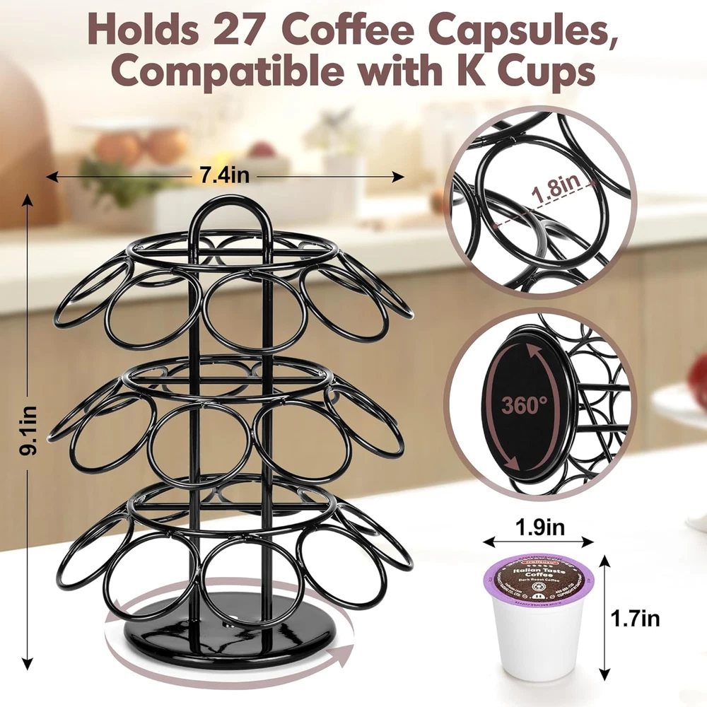Coffee Pod Holder, K Cup Holders, 3 Tier Coffee Pod Carousel Compatible with K Great Capacity Holds 27 Pods: ROWISE coffee pod holder is compatible with K cups coffee pods, Total 3 tier and each tray could be storaged 9 pod for Keurig which can display and store your coffee pods neatly. Quality Material: The whole K cup carousel is made of metal and covered with powder black finished. Rust Proof and heavy duty are the guarantee for long lifetime. 360 Degree Revolving Base: Unique layering and 360 degree rotation design,it become easy to sort and view your coffee pod collection by flavor/brand or packaging. Saving Space: Our K-pod holder is designed with small footprint. Size: 7.3???L x 7.3???W x 9.1???H. With 360 degree rotation feature, you could get K pod which in each angle. Maximize the utility with the smallest area. Easy To Use: Just twist the accessories together and coffee pod racks installation is finished. Without any tool, easy to install. And it allows you to adjustable its height to take out some tray which you don't need. Perfect Gift for Your Family and Friends: Unique design and innovative packaging,it is a perfect gift for your friends , family and coworker who like to drink coffee. And you can place it at home,in the office,or anywhere else you want to use it.