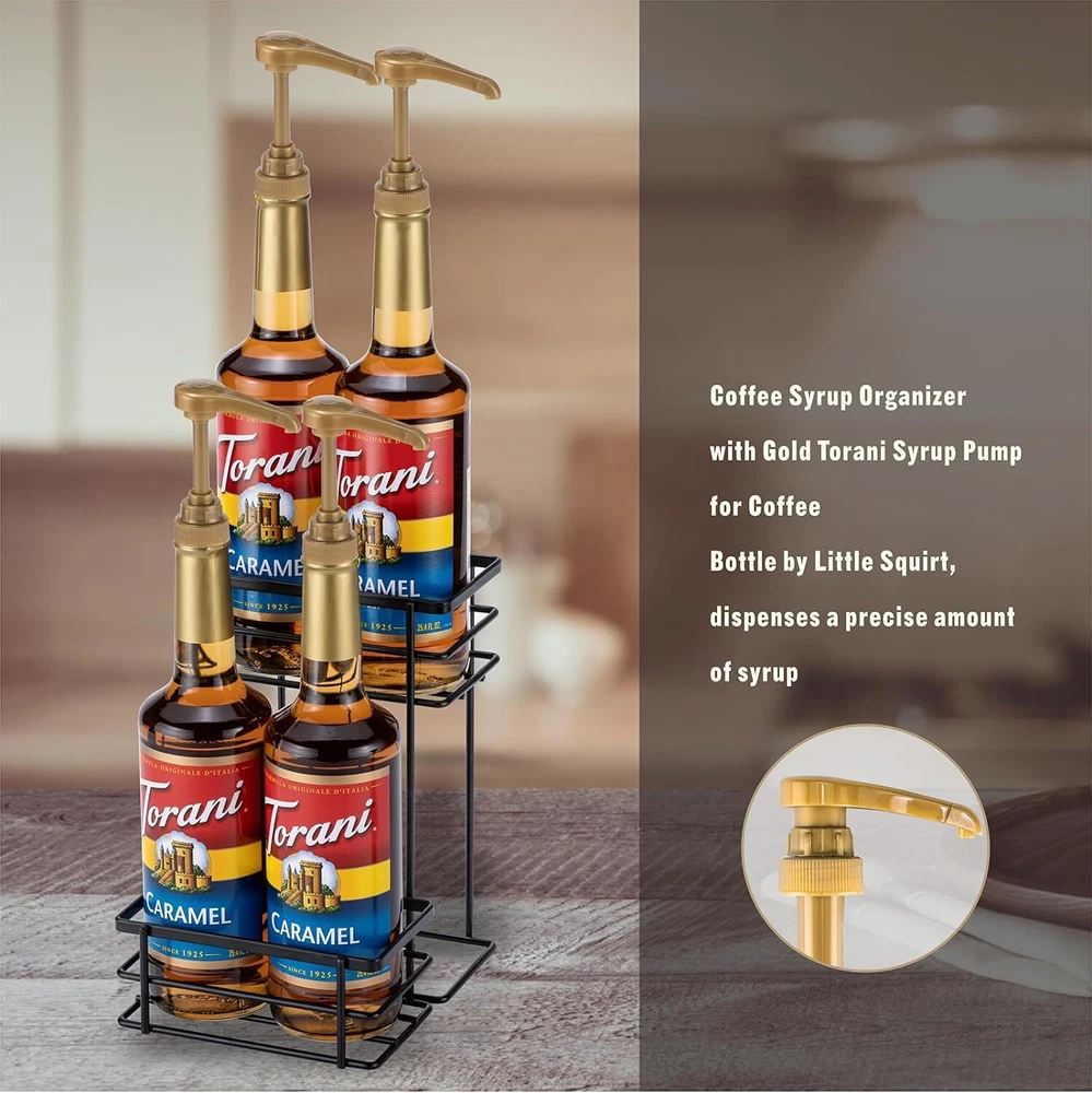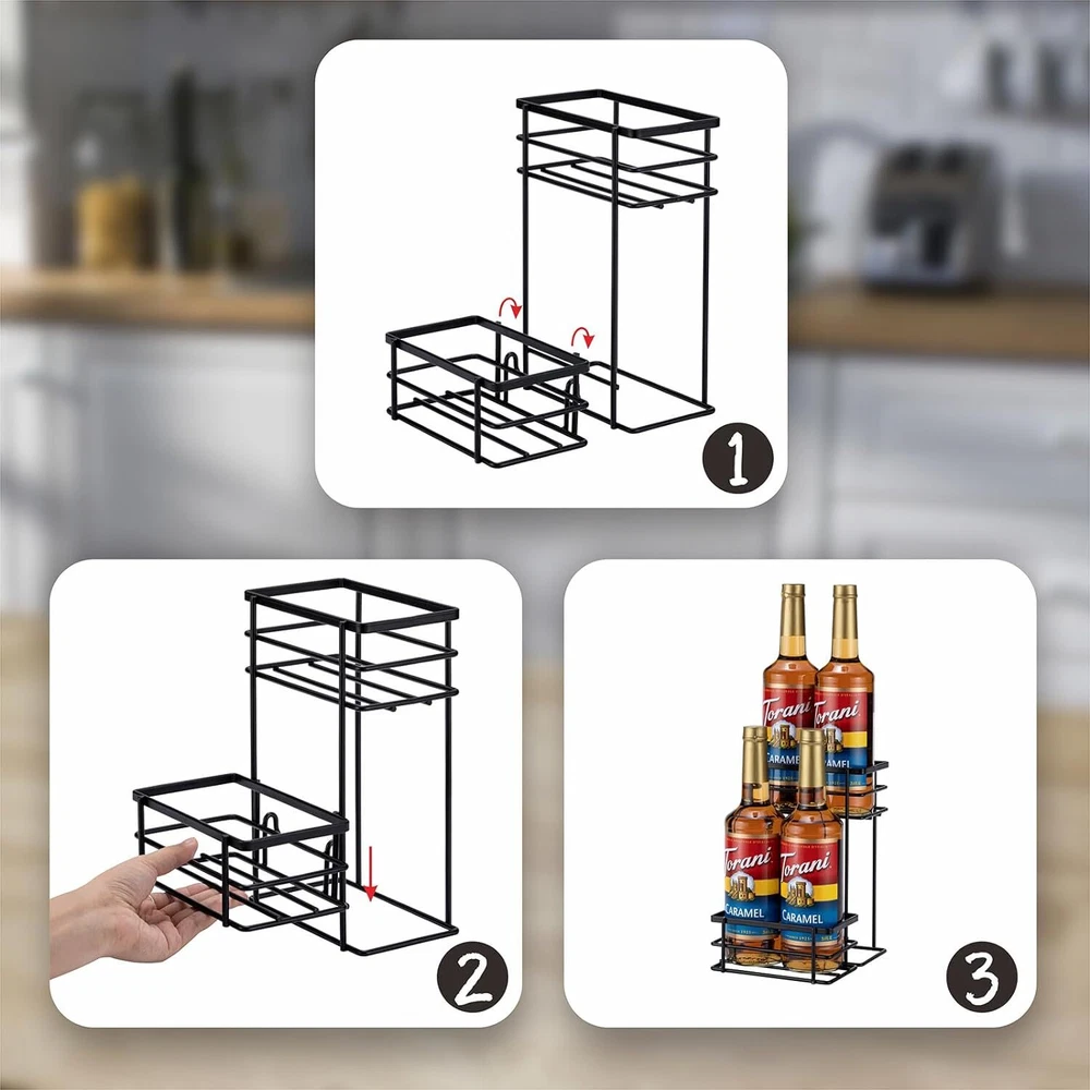 Coffee Syrup Organizer Rack, (4 Bottle Capacity),2 Tier 4 Capacity Product Details Brand: Rice rat Color: 4 Bottle Capacity Product Dimensions: 7.9"D x 6.4"W x 9.9"H Style: Modern Product Care Instructions: Wipe with Dry Cloth Bottle Count: 12 Item Weight: 2.23 pounds MaterialMounting Type: MetalCountertop Item WeightAssembly Required: 2.23 PoundsYes [COFFEE SYRUP ORGANIZER]: Store your favorite syrups in this tasteful syrup holder and sweeten your drinks with a variety of flavors, Fits with 25.4 oz(750 ml) Torani and Monin Syrup bottles and other kitchen containers or bottles. [Space Saving Design]:2 Tier syrup bottle holder will help save space,compact Design takes up minimal Space on your countertop or shelf,Can be stored up to 4 bottles in this bottle caddy, 2 standard syrup bottles one each tier. [Durable Material]: Made from high-quality and sturdy metal, our Coffee Syrup Rack can withstand daily use,Simple installation.The smooth and rust-resistant finish makes cleaning a breeze. Perfect for storing condiment containers. [Elegant Design]:Coffee Syrup Rack sleek black metal frame and its design allows it to fit and decorate every type of environment, its hardened durable black iron steel metal fits esthetically in any room.Not just for coffee syrups.It's perfect for storing spices, olive oils, vinegars, and more, maximizing your kitchen space. [Coffee Syrup Pump Dispenser]:Coffee Syrup Rack with Coffee Syrup Pump Dispenser,More convenient use of coffee syrup.