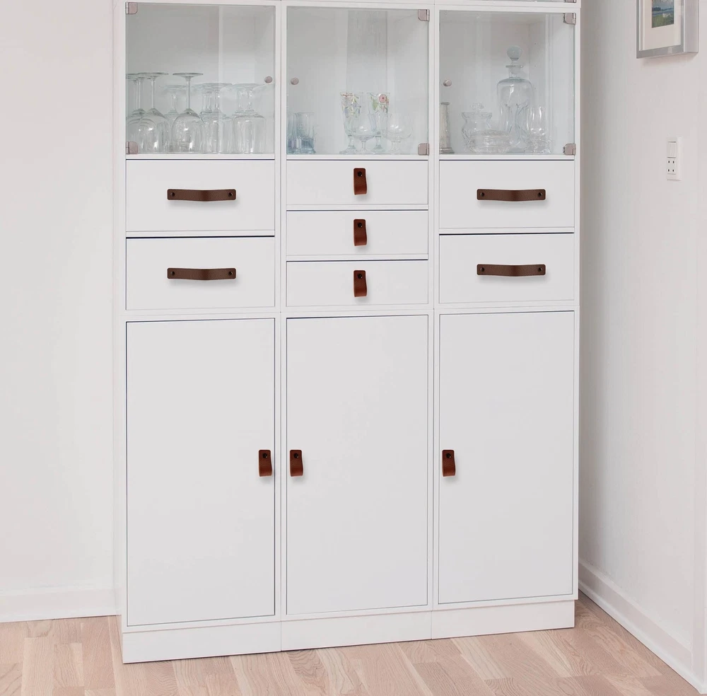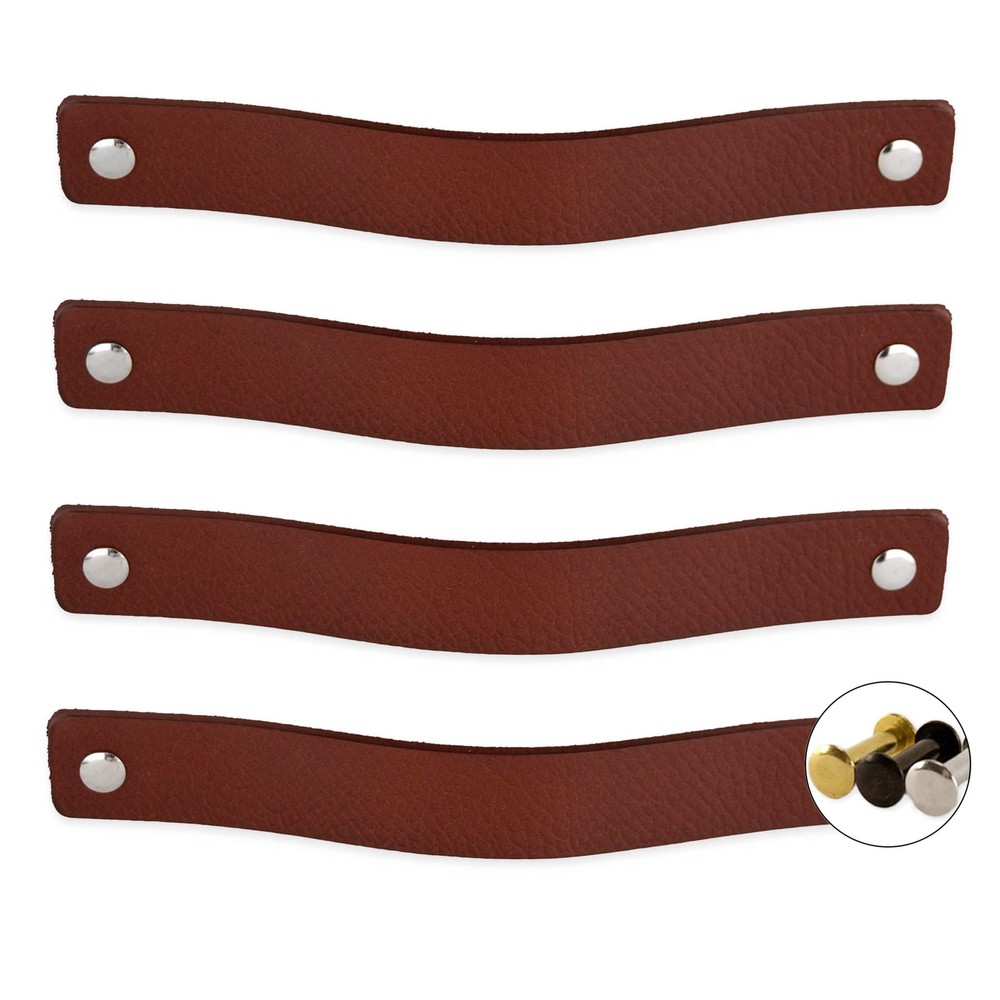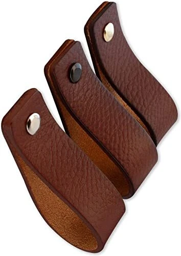 👍 IMPROVE YOUR FURNITURE: Attach these beautiful leather handles to your existing furniture to transform and enhance them. These leather drawer pulls are meant to create an industrial effect to give your home the perfect finishing touch. Our handles are made with care and craftsmanship to the highest standard. These leather handles don’t look like plastic and feel very strong. 🔨 12 SCREWS INCLUDED: Each leather handle comes with 3 colors (silver, gold and black) screws to satisfy your needs. Thickness of the leather pull is about 1/8-in, width is 1 inch. For our is 7-7/8-in leather handle length, the optimal size between the two holes in your cabinet or closet is between 5-29/32-in and 6-29/32-in. The diameter of the hole is ⅕ inch. Our leather handles are also available in length sizes 5 inch, is 6-1/2 in and 9-13/16-in. 📏 NO NEED TO WORRY ABOUT THICKNESS OF YOUR WOOD: We include short and long screws. Screw length is flexible from 4/5-in to 1-11⁄16 inch. If you use the handle as a loop the thickness of wood can be between 3/5-in and 1-1/2-in. If you use the handle as a drawer handle thickness of wood can be between 11/16-in and 1-19/32-in. Extend the screw yourself with a M4 bolt from the department store or shorten it with a saw. 💎 BEAUTIFUL LEATHER: Our leather pulls and knobs are handcrafted and hand cut in a small village where the tradition of fine leather crafting has been passed down from generation to generation. Once the leather handle and pull is finished, they are left in the indirect sun to dry for another day. You can clearly see that we use authentic full grain leather for our leather knobs and pulls. 👶 SOFT MATERIAL: In contrast to metal pulls or cabinet knobs, these handles are soft and flexible to hold. Leather pulls are much safer than steel handles or knobs. If your young child falls and hits the head against a steel handle, this may lead to injury. Leather drawer pulls are soft and do not have an angular shape, such as steel handles.