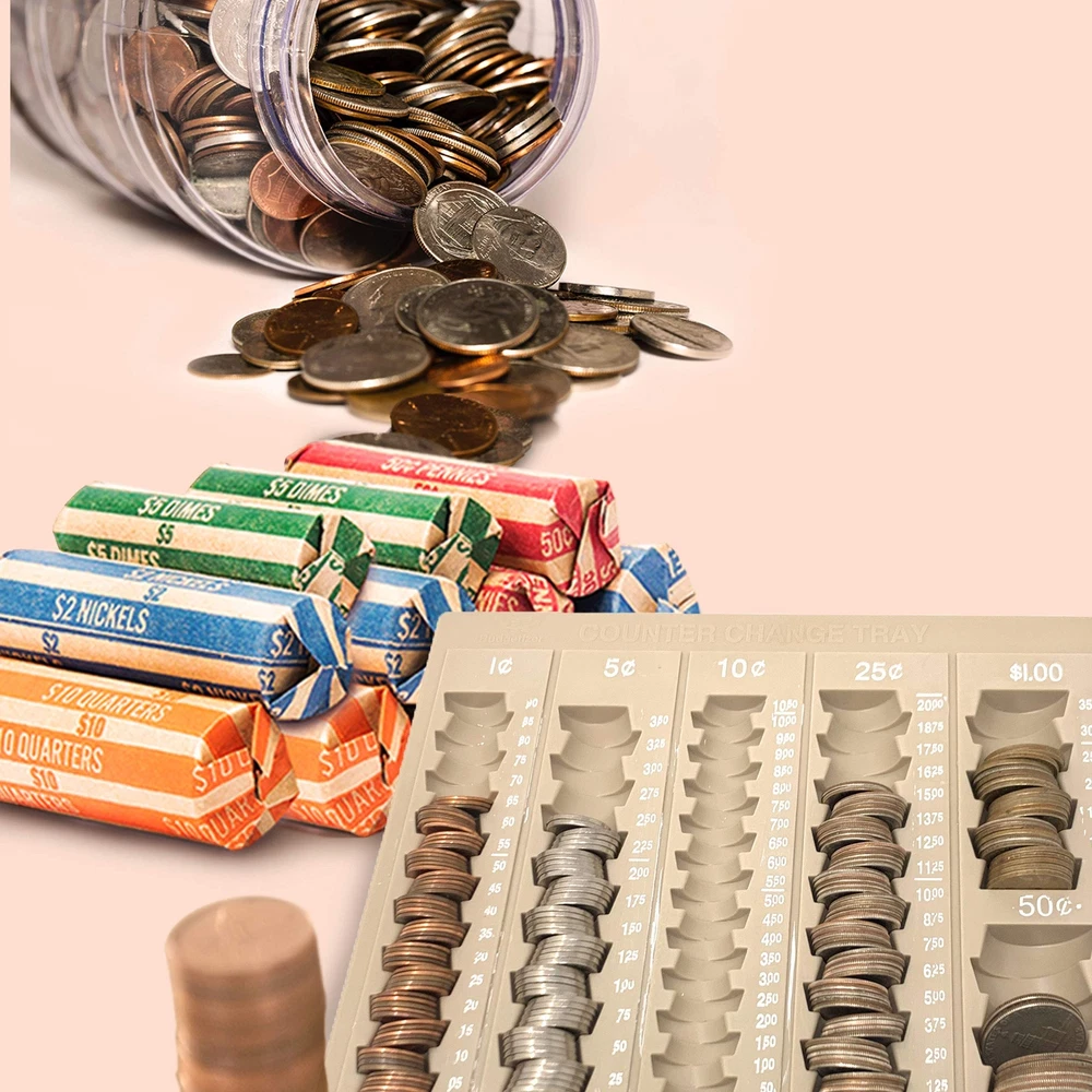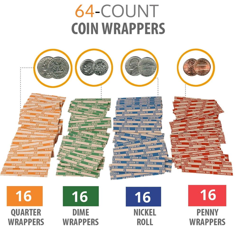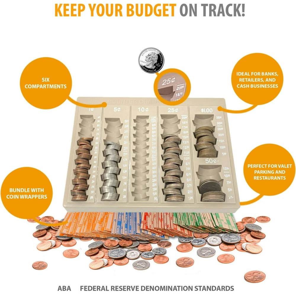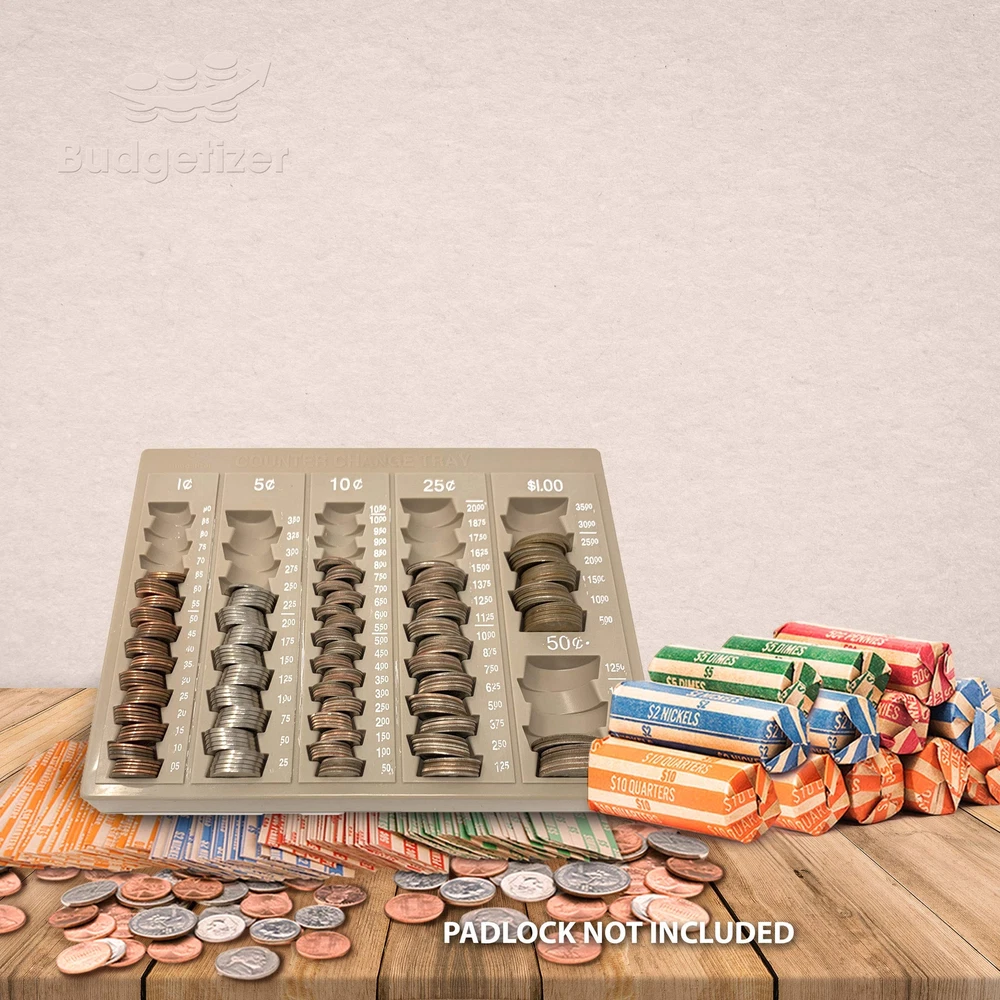 Are you looking for practical coin storage boxes to use as a coin counting tray? If the answer is YES, then click 'Add to Cart’ to receive Budgetizer’s Coin Sorting Tray with 64 BONUS Coin Paper Rolls 6 USEFUL COMPARTMENTS – Our large capacity coin tray allows you to store 100 Pennies, 75 Nickels, 110 Dimes, 80 Quarters, 25 Half Dollar Coins and 35 Dollar Coins for a total worth of 83 dollars and 25 cents. Each compartment is clearly labeled for quick and easy coin counting and adding up totals. We prioritize quality which is why we make sure our money counter is durable as well as lightweight. BUNDLED WITH 64 COIN WRAPPERS – Budgetizer’s heavy duty kraft paper coin wrap bonus includes 16 Quarter rolls, 16 Dime rolls, 16 Nickel wrappers and 16 Pennies wrappers. SECURE COVER - Unlike other trays, Budgetizer’s tray counter give you the opportunity to place a lock to make sure your money is securely kept while you are gone or changing shifts. PERFECTLY SIZED – Each change tray measures 9.75 inches Long, 7.6 inches Wide and 1.6 inches Tall. IDEAL FOR BUSINESS OR HOME USE - Budgetizer’s coins tray is the optimal coin counting tool for any business, restaurants, shop, bank teller or individual home use. WARRANTY INFORMATION – We ensure that our coin trays for safes will meet your expectations. If for any reason, it doesn’t, we offer returns without questions asked. If you have any issues with our coin separator or coin counter jar bundle, do not hesitate to contact us and we will be more than happy to ensure you have a positive experience. Attention Coin Trays are Painted by Hand - Please know that there might be some extra paint on the trays since these are painted by hand. We know this and that is why we are giving you a very reasonable price for this product. The functionality is the same and the product is new. WARRANRY INFORMATION- if for any reason you are not satisfied send us a direct message and we will take care of you and make sure you have a positive experience, please just let us know! Bundle Includes 64 Coin Wrappers – This unique coin counter bank includes 64 Coin Rolls Wrappers that are easy to use and will keep your coins safe; Our money wrappers are made with high quality heavy duty kraft paper and are distributed by 16 Quarters wrappers, 16 Dime wrappers, 16 Nickel roll and 16 Pennies rolls; Our coin tray and coin rolls bundle will give you the best value for your money and help keep your budget on track 6 Practical Compartments with Secure Lock Cover – Budgetizer’s money tray features clearly labeled coin containers for Pennies, Nickels, Dimes, Quarters, Half Dollar Coins and Dollar Coins; Our exclusive cover gives you the ability to put a lock to keep your money safe while it is closed; Our coin sorter cash tray is also strategically designed with staggered compartments for effortless use and clearly labeled numbers to help you count your coins or add up totals quickly Ideal for Businesses and Individual Home Use – Our coin organizer is the ideal tool for bank tellers, businesses, restaurants, shops, homes, offices and much more; Unlike other cash and coin counter supplies, Budgetizer’s coin bank is the allows you to place a lock while it is closed making it ideal for shift changes; Once you have filled your counting tray with all your change then you can use our coin wrappers assorted colors to store your coins Large Capacity Coin Counter Tray – Budgetizer’s large coin holder allows you to hold up to 83 dollars and 25 cents; With our change counter you can store 100 Pennies, 75 Nickels, 110 Dimes, 80 Quarters, 25 Half Dollar Coins and 35 Dollar Coins; Make sure you never lose your coins again and have them organized at all times with our unique coin counters and sorters; Our coin sorters are made with high quality materials that are both durable and lightweight