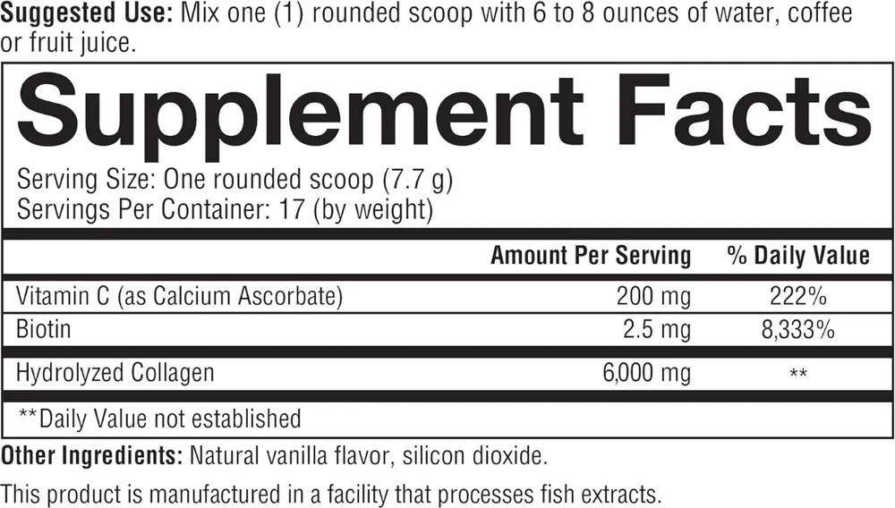 Colageno Hidrolizado En Polvo Para Los Huesos Articulaciones Uñas Pelo Y Piel U US Warehouse - FREE & FAST Shipping in US Product Description: These statements have not been evaluated by the FDA. This product is not intended to diagnose, treat, cure, or prevent any disease or health condition. Collagen Supplement: Collagen Powder helps replenish this vital protein to support skin, hair, nails, tendons, and ligaments* Hydrolyzed Collagen Powder: Our hydrolyzed collagen formula is highly bioavailable, which means it is easily and rapidly absorbed in the body* Vitamin C & Biotin: In addition to collagen, this powder supplement has vitamin C, biotin, and 18 amino acids Dairy-Free Supplement: Our quality dietary supplement is dairy-free, soy-free, and gluten-free, making it accessible to many dietary restrictions The Promise: Everything we do is based on a dedication to build pure and effective supplements to support our mission to inspire wellness in all Feedback: 1.Any question for your order, please contact us in time, we will reply to you within 24 hours and give you a satisfactory answer. 2.If you are satisfied with our products and services, hope to take up your a little precious time to leave feedback reviews for our products.Thanks! 3.Your satisfaction is our effort. Welcome to order again! Have a great day! Our Policy: 100% Satisfaction Guarantee 20% of restocking fee will be charged for return item