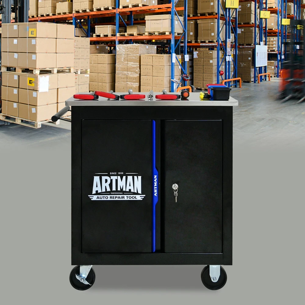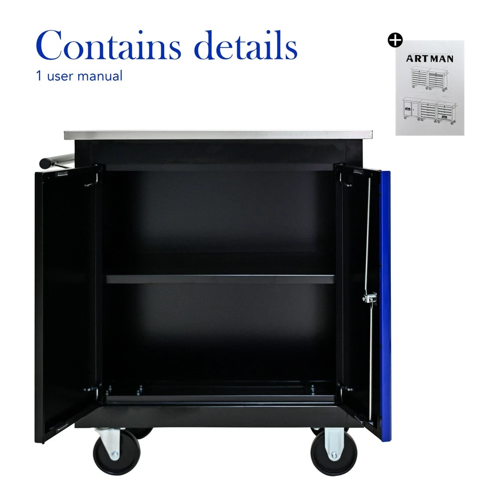 Features and Details: This assembly trolley has 4 steering wheels, 2 of which with parking brakes, so you can move the trolley freely in the garage, but also stop in one place. The storage surface provides additional space for storing and arranging tools you often need. The robust and powder-coated steel construction is used for high wear resistance. This is a set of cabinets, can use a round hook at the bottom of the table to connect another tool car, thus forming a combination. Specification: Color:Black+Blue Material:Cold Rolled Steel Surface Finish:Powder Coating Casters:4" Casters (2PCS with brake and 2PCS without brake) Product Size (with wheels and countertops):25.91*13.58*26.46INCH Package Size:27.36*15.16*28.94INCH Product Size (with countertops):25.91*13.58*25.98INCH Net Weight:39.24LBS Gross Weight:46.08LBS