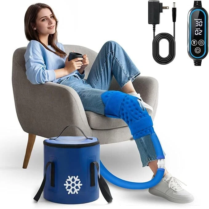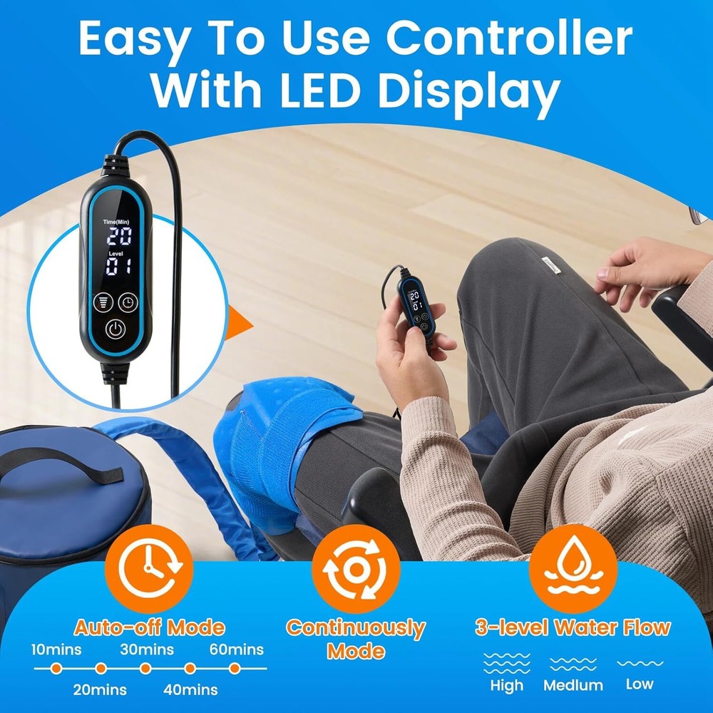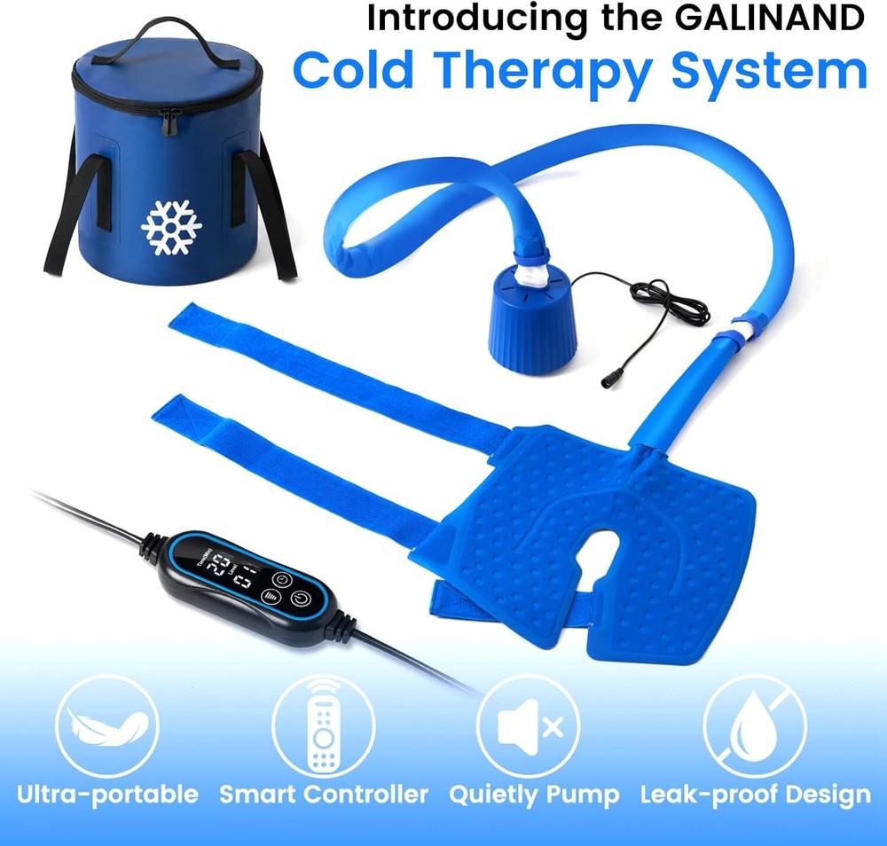 Cold Therapy Machine, Ice Machine for Knee Care After-Surgery, Knee Replacement Recovery Equipment Aids Pack, Cryotherapy System w/Compression Wrap Pad for Ankle, Foot, ACL Relief EFFORTLESS SETUP & USER-FRIENDLY: The GALINAND portable cold therapy system features a detachable high-performance pump, collapsible insulated cooler, ergonomic knee compression pad, and intuitive digital controller 2.0. Enjoy tool-free assembly with quick-connect fittings and hassle-free one-click easily disassemble for cleaning and compact storage after treatment sessions. This streamlined system saves valuable recovery time with professional-grade cryotherapy that's as simple to operate as it is effective. CUSTOMIZATION ON/OFF CYCLE: Features smart programmable cold therapy with an auto-cycling timer. Simply set your preferred treatment schedule and let our intelligent digital controller 2.0 alternate between active cooling and rest periods automatically-day or night. Perfect for post-surgery recovery and knee pain management, this solution delivers continuous targeted relief while eliminating safety concerns during extended use. Sleep soundly knowing your therapy sessions stay precisely controlled. ULTRA-QUIET OPERATION&PATIENT-FOCUSED SAFETY: Featuring next-generation silent pump technology with advanced brushless motor design, our system delivers near-silent therapy at under 18 dB-quieter than a human whisper. The innovative GALINAND therapy system combines three safety-enhanced components: a medical-grade silicone treatment pad, our patented Quick-connect coupling mechanism, and reinforced tubing with leak-resistant architecture. COMPACT&LIGHTWEIGHT DESIGN: Reimagine convenience with our space-saving ice therapy machine that eliminates bulky, heavy alternatives. Featuring a foldable leak-proof bucket and weighing just 3.5 lbs with a 10-inch diameter footprint, this portable solution combines effortless mobility with space-efficient storage. Experience clinical-grade cold therapy anywhere - easily transport it between home, office, gym, or travel destinations. EXTENDED COLD THERAPY PERFORMACNE: Engineered with a heavy-duty 500D PVC exterior and an 8mm insulating foam liner, our ice bucket delivers professional cold therapy for up to 8 hours. The 12-quart capacity holds up to 8 standard 16.9 oz frozen water bottles, allowing you to maintain consistent cold therapy sessions without disruptive ice replacements. Sturdy construction and optimized insulation work together to keep your therapy sessions going strong-minimizing downtime while maximizing recovery efficiency. Features: Leak Proof, Refillable, Wearable, Adjustable