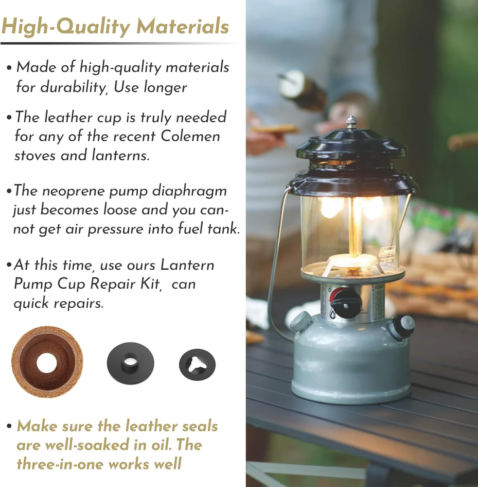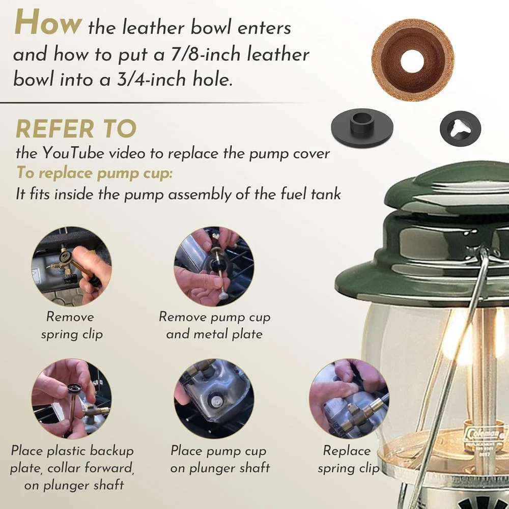 Store New Arrivals Add to Favorite View Feedback Contact 3000005094 for Coleman Lantern Stove Pump Cup Replacement Kit with Leather Description Item model number 3000005094 Power Source Gas Powered Product Dimensions 3.56"L x 1.79"W x 0.35"H Material Leather, Metal Country of Origin China Item Weight 0.02 Kilograms Fuel Type Lantern Fuel Pump Lantern&stove replacement parts: Keep your Coleman stove and lanterns running smoothly with the Coleman Replacement Pump Cup Kit. (part #: 3000005094 ) Compatible with Coleman Parts: Fits Pump assemblies on all Coleman stoves and lanterns, with fuel tank models, including 222, 226, 229, 400, 440, 442, 445, 450, 550, 3022, and 3024. Package includes: This kit includes a leather pump cap, metal nut, and plastic cap that work together to create an airtight seal when pumped. Long-Lasting Durability: Our camping stove leather pump cups are made of high-quality materials. Products meet OEM standards and are tested to ensure a perfect match with your Coleman light or camping stove. Easy installation: Our camping stove leather pump cup kit, Easy to install in just a few minutes. compared to buying a new lantern or stove. Using this Coleman Leather Pump Cup replacement part of ours can save you time and money (Please watch the installation video) 100% satisfaction guaranteed: Please buy with confidence, For any reason If you are not satisfied with Pokin products, or have any questions about the products you received, please let us know and we will provide professional after-sales service to ensure your satisfaction. Product Description Products Specifics: Part Number: 3000005094 Material: High-Quality Materials Compatible brands: Coleman Included Components: Pump Cup Fits Most: Liquid Fuel Lanterns and Camp Stoves Wide compatibility: Fits all models of Coleman lanterns and stoves that have a fuel tank Lantern Pump Cup Repair Kit The following parts are included: 1* Leather Pump Cap 1* Metal Nut 1* Plastic Cap These parts sandwich together inside the pump so that the leather cap can create an air seal when pumped. Note: Theleather cap will need to be oiled before use, which can be found as part #: 200K2251 (not included). To replace pump cup: Installation steps 1) Remove spring clip. 2) Remove pump cup and metal plate. 3) Place plastic backup plate, collar forward, on plunger shaft. 4) Place pump cup on plunger shaft. 5) Replace spring clip. Warm Prompt: The metal nut (the piece with the triangular opening) fits below the leather piece closer to the inside of the lantern, while the plastic part fits above the leather piece. ABOUT US We offer the best prices around on high quality products. Our E-store includes media such as books, movies, music and games while offering electronics, toys, sporting apparel, clothing, tools, general home, garden items and more. SHIPPING We are always working hard to ensure your package arrives as soon as possible. Please understand that some factors like weather, high postal traffic, and the performance of shipping companies are outside of our control. We offer free shipping to the lower 48 states and ship within 2 business days of payment, usually sooner. We do not accept P.O. Boxes. Please provide a physical address. RETURNS We offer a 30-Day Return Policy on items which you are not completely satisfied with. You have the option for a full-refund or an exchange of the item. No returns are available on items shipped outside of the USA. PAYMENT We accept PayPal. CONTACT US This page content is yet to come Please ad us to your favorite seller and visit again later Thank You CUSTOMER SATISFACTION We try our very best to make sure every customer is completely satisfied. If there's a problem, message us! We're happy to help.