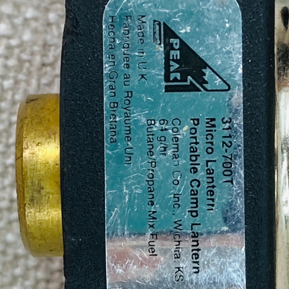 This is a vintage Coleman Peak 1 Single Mantle Micro Lantern that runs on butane/propane gas. It is black in color and made of plastic and metal. The lantern is compact, with dimensions of 5 inches in height, 4 inches in length, and 3 inches in width. It features gas lighting technology and can support 1-3 lights. Please note that mantles are not included with this lantern.