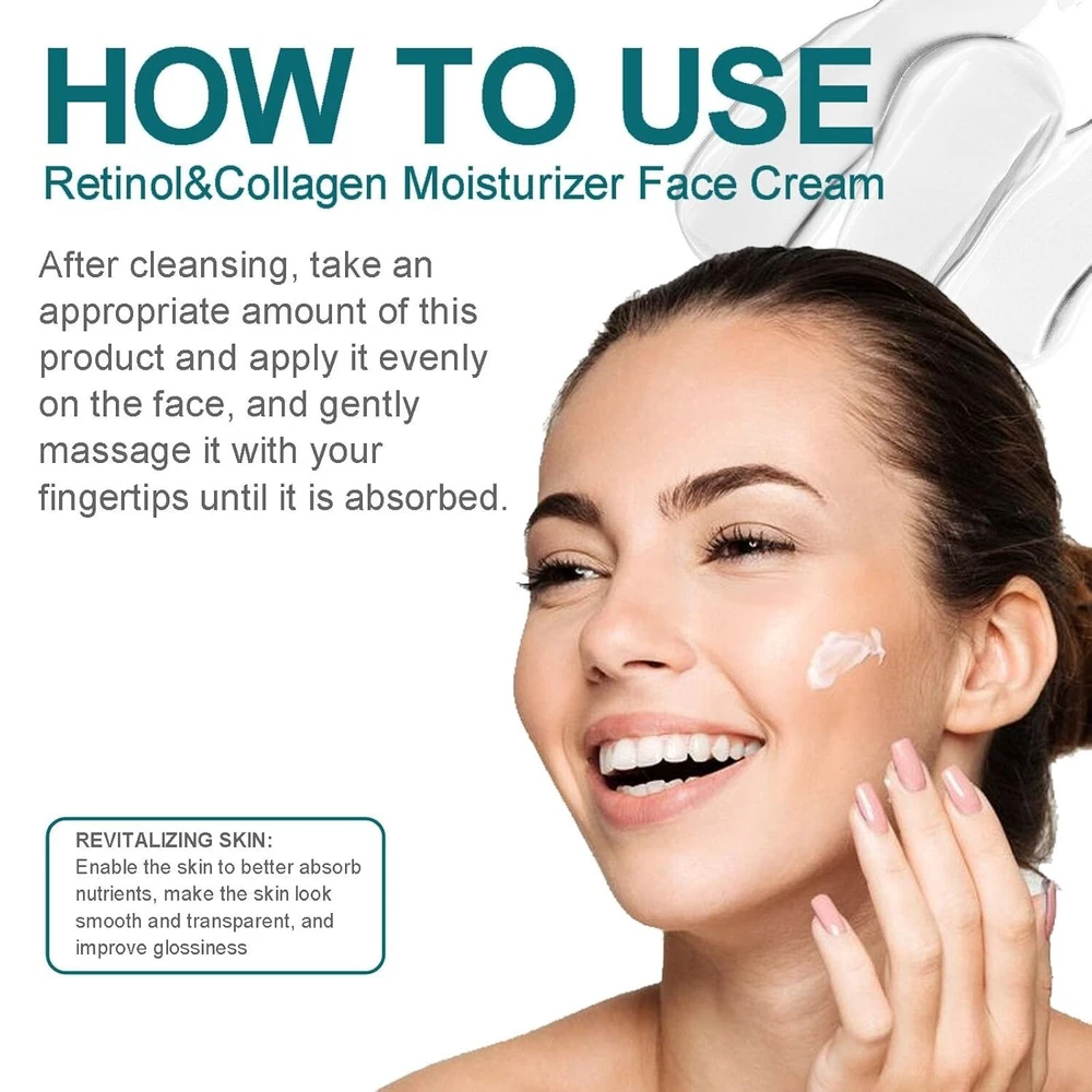 Advanced Retinol Collagen Cream for Face with 5% Hyaluronic Acid Anti-Aging Cream Anti-Wrinkle Reduce Fine Lines Lifting and Firming Cream 24-Hour Facial Care Suitable For All Skin Types 【Anti-Aging Retinol Cream】: Regular use of our retinol and collagen-containing cream will help restore skin's radiance and elasticity. Retinol facial moisturizer removes fine lines, age spots and exfoliates the skin. Can be used on face, neck and décolletage areas. 【Lifting and Firming Cream】: Enriched with retinol, hyaluronic acid, and collagen, this cream will help your skin become tighter, and smoother within days of use, and it also effectively Cell renewal normalizes and locks in moisture for a more youthful appearance. 【Care for Your Skin Day and Night】 : This retinol anti-aging cream has a push-on design, which is easy to use. Its texture is light, easy to absorb and non-greasy. It provides deep moisturizing. It can be used during the day to protect and moisturize the skin, and at night. Repair and nourish. 【24-Hour Facial Care】: Unlike other facial skin care products that often contain artificial fragrances and harsh ingredients, our Retinol and Collagen Cream is specially developed to fight age by effectively smoothing skin, clearing pores, eliminating acne and Rejuvenates skin and helps reduce signs of sun damage, fine lines, wrinkles, blemishes, uneven skin tone and sagging. 【Suitable For Most Skin Types】: Suitable for all skin types, our Retinol Collagen Cream contains 5% Hyaluronic Acid to soothe skin and ensure better absorption. Flavonols provide natural, powerful rejuvenating effects. Note: This Product is designed to deliver optimal results, offering high-quality performance and satisfaction. Please note that individual experiences and outcomes may vary based on personal use, preferences, and unique circumstances. For best results, we recommend following the provided guidelines and ensuring the product is used as intended. Product result may vary for every individual. NOTE Hello Buyer, Thank you for your interest in our product! Please note that I am a reseller, and your order will be shipped directly from our nearest warehouse to your address. If you have any questions or need assistance, feel free to reach out.