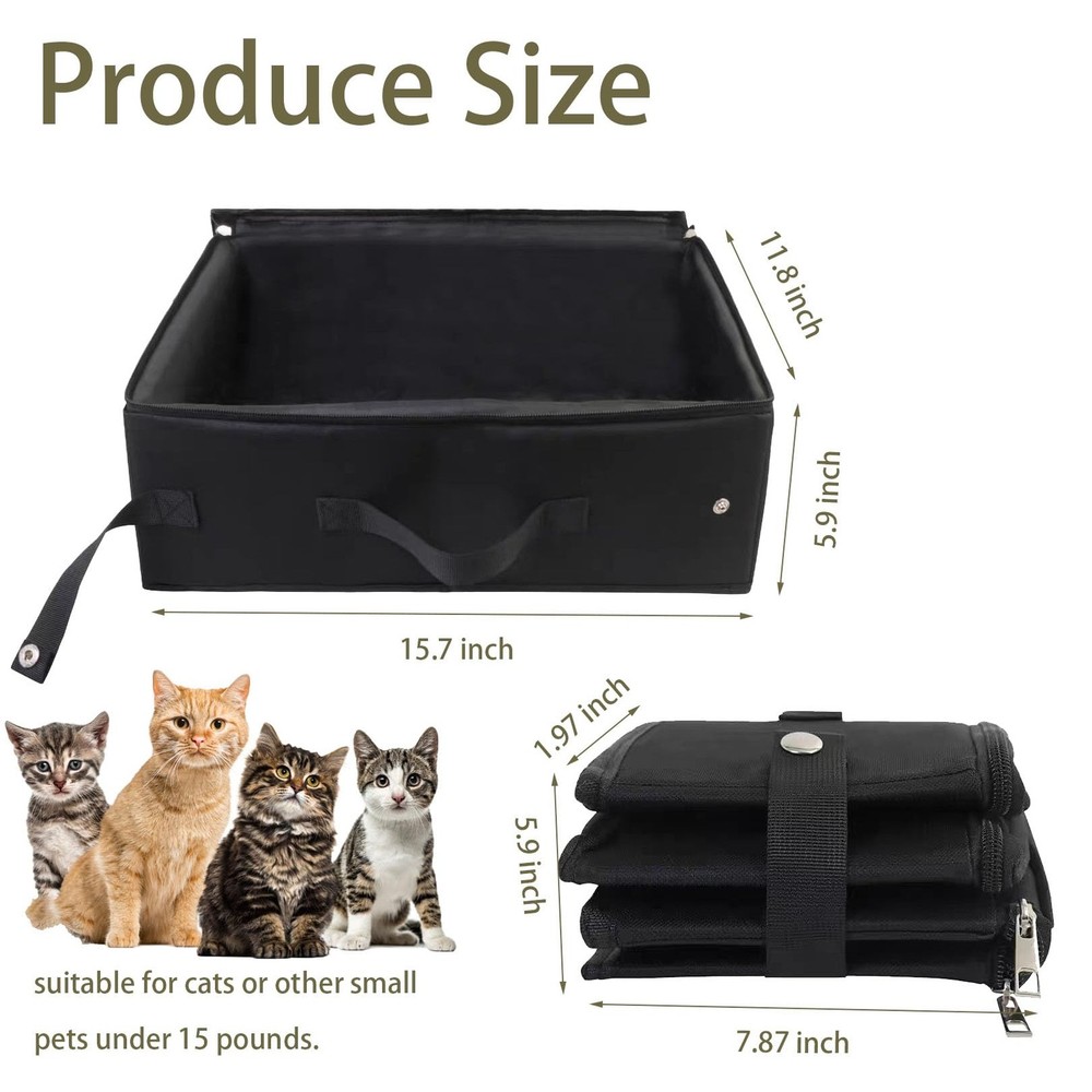 SPECIFICATIONS: Material: Oxford Material and PE lining Folded size: 7.87*5.9*1.97 inches Expanded size: 15.75*11.8*5.9 inches Color: Black grey Applicable Object: Cat and Dog Universal Package Contents: 1 *Portable Cat Travel Litter Box with Zipped Lid Travel Litter Box for Cats: Portable litter box for cats made of encrypted oxford fabric to prevent scratching and biting, sturdy side panels ensure easy access while maintaining shape, making it the cat travel litter box Suitable for Cat Travel: Cat travel litter box folded size: 7.87 x 5.9 x 1.97 inches, easy to carry in and out of hotel rooms. Unfolded size:15.75 x 11.8 x 5.9 inches, suitable for cats or other small pets under 15 pounds Leak-Proof: Seamless design and fabric prevents liquid leakage, zipper closure at the top prevents litter spillage Easy To Carry and Space Saving: Portable cat litter box for travel is lightweight, easy to carry and requires no assembly, you can easily store it in your luggage or carry it by hand without worrying about taking up travel space Wide Application: Portability and foldability make it suitable for multiple scenarios, home use, outdoor use or use in the car