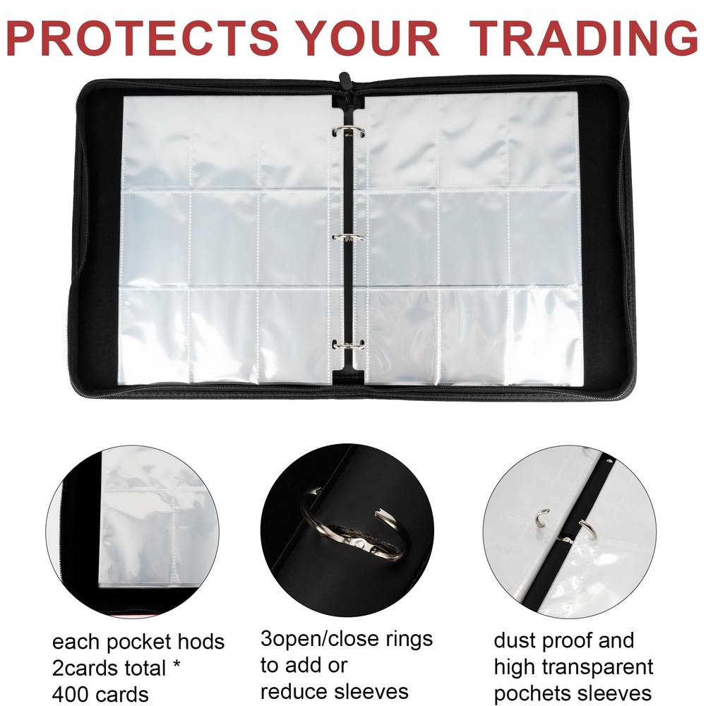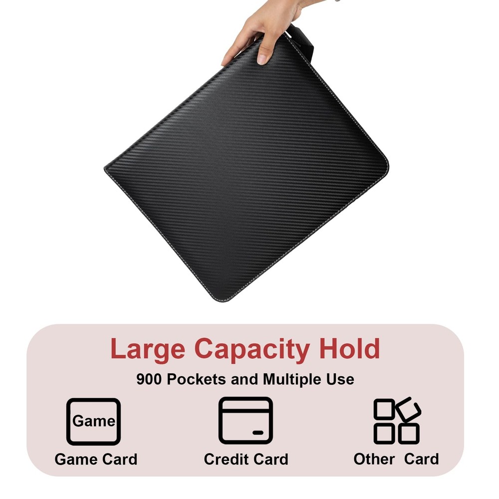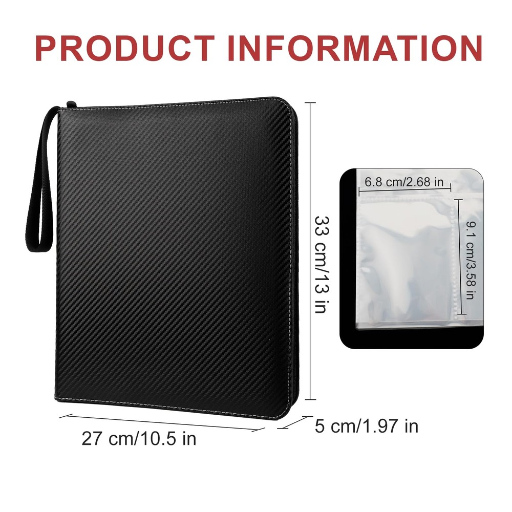 Collectible Trading Card Albums Large capacity :18-bag card holder, 50 page set, can accommodate 900 cards. Store and display your cards in this transaction card binder to maintain keep them organized. High quality fabric: The Card Holder is made of high-quality PU leather, which is durable and waterproof. The highly transparent card holder is easy to display, and the high-quality zipper design can protect the card,Metal ring,Velvet lining Card binder: The internal card slot size of the transaction card holder is 3.58 * 2.7 inches; This binder is suitable for all standard size cards, such as baseball cards, football cards, basketball cards, game cards, etc. Convenient to carry: The wrist strap design makes the clip easy to carry to friends' homes or parties. Show your precious cards to your friends at any time Best Gift :This is an ideal gift for card collectors, friends and children ; Compatible with Multiple Standard Cards or Game Cards.