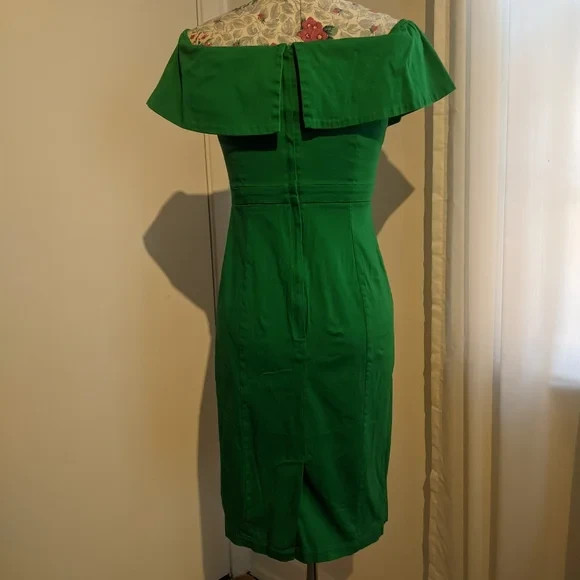 Embrace timeless elegance with the Collectif Green Pencil Dress, a must-have for your wardrobe that offers a touch of classic sophistication. Perfectly capturing the essence of the 50s, this sleeveless garment features an alluring off-the-shoulder neckline and a convenient zip closure at the back. Its solid green hue is versatile and flattering for a range of occasions, from formal events to cocktail parties and even weddings.Crafted from a comfortable cotton blend, this midi dress is designed to fit a regular size small, enhancing your silhouette with its sleek and structured style. Whether you're stepping out in the spring bloom or under the summer sun, this dress is an exquisite choice that promises to weave charm and grace into your every movement. Bust 34", waistline 27", waistline to hem 23". House with cats.