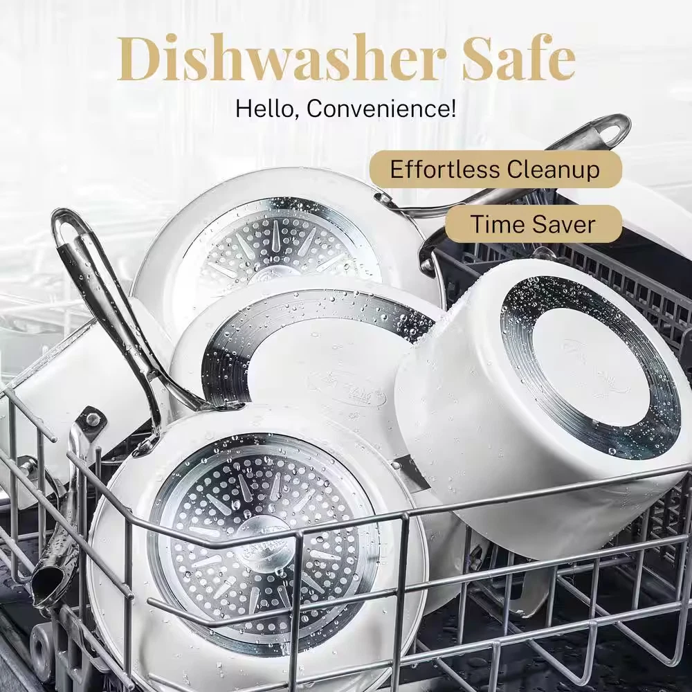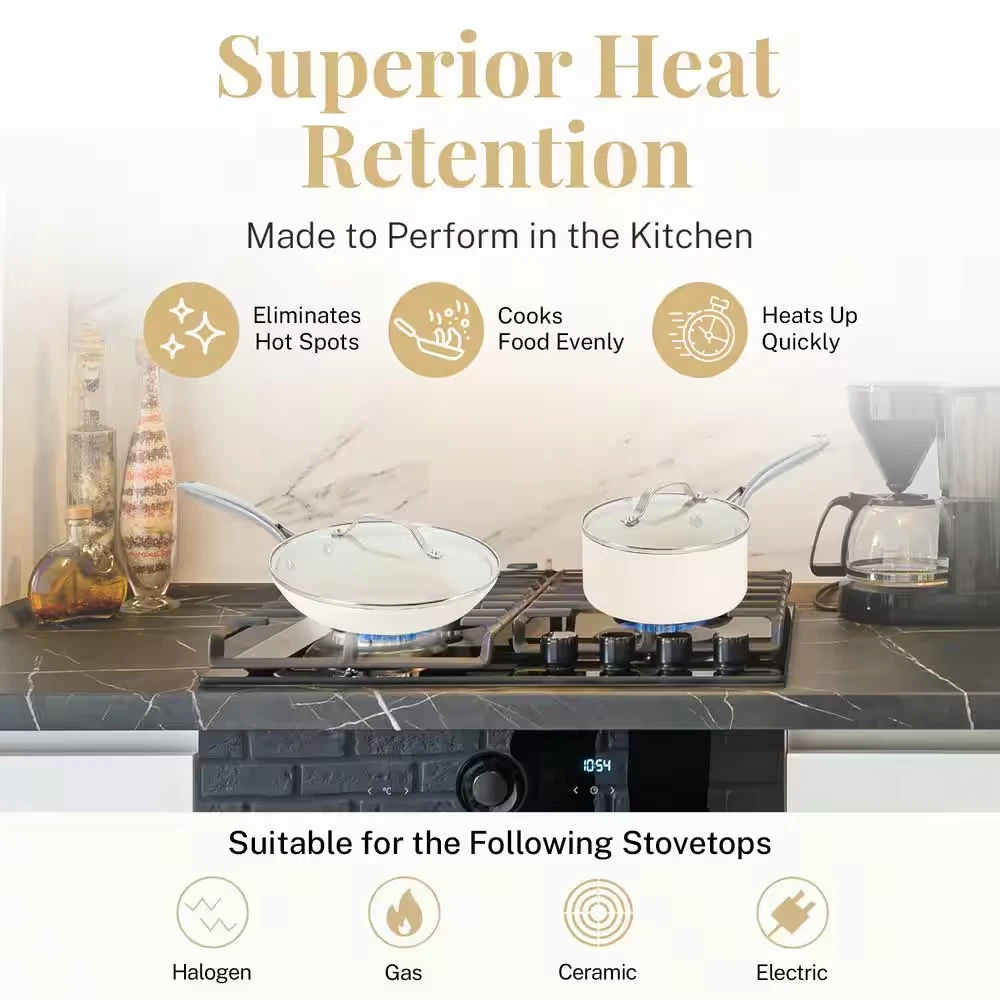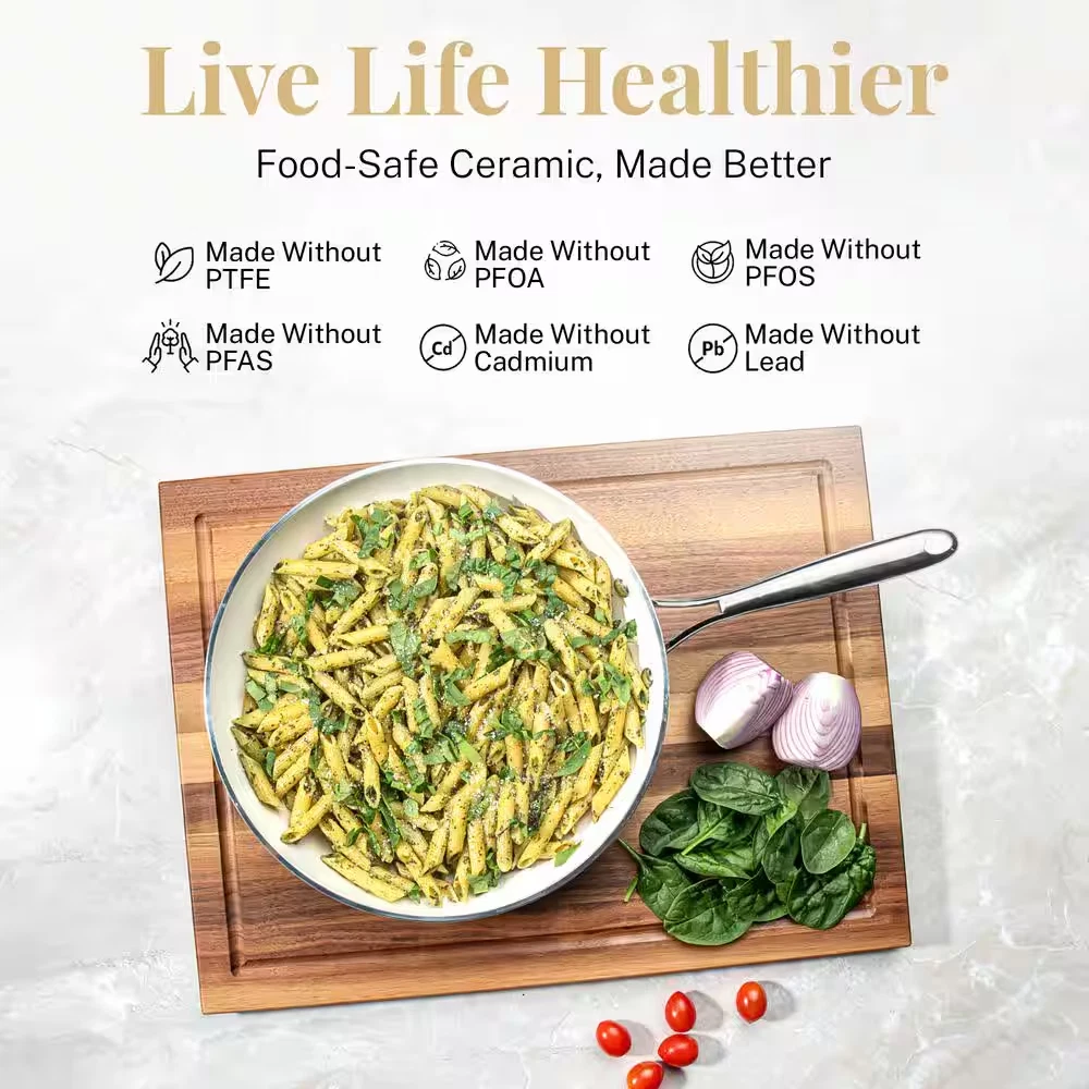 Fast Shipping On All Items 30 Days Money Guarantee Customer Support Excellent Service 100% Satisfaction Satisfaction Guaranteed Collection 20-Piece Aluminum Ultra Performance Ceramic Non-stick Set in Cream Specification Color Family Cream Color/Finish Cream/Stainless Steel Cooktop Compatibility Electric Coil,Electric Smooth Top,Gas Features Ceramic Nonstick,Dishwasher Safe,Heat Resistant Handle,Oven Safe,Stainless Steel Handle Includes Fry Basket,Frying Pan,Glass Lid,Knives,Rack,Saucepan,Skillet,Steamer Insert,Stock Pot Individual/Set Set Kitchen Product Type Cookware Set Material Aluminum Maximum Heating Temperature (Fahrenheit) 500 Number of Pieces 20 Number of cookware pieces 20 Package Type Set Returnable 90-Day Manufacturer Warranty 10-Year Limited (n/a) Item Description Non-stick ceramic surface enables easy food release Stainless steel stay-cool handles offer a comfortable grip Dishwasher safe for easy cleaning Elevate your kitchen with chic cookware that brings a modern aesthetic. Meet Gotham Steel Natural - where form seamlessly meets function. Designed with a scratch-resistant, nonstick ceramic surface, this cookware isn't just stylish; it's also committed to your well-being. Crafted to be non-toxic and health-conscious, it's made without PFOA, PFOS, PFAS, PFTE, lead, or cadmium. Its nonstick surface allows you to cook without excess oil and butter, ushering in a healthier approach to cooking. Food slides effortlessly off the pan when used on low or medium heat as directed. And after your culinary adventures, cleaning up is a breeze-simply wipe them down or pop them in the dishwasher! Thanks to a durable interior, your dishes heat up swiftly and evenly, while the stay-cool handles make maneuvering a breeze. Take the transition from stovetop to oven to table in stride, as this set is oven safe up to 500˚F. Whether it's for college grads, a newlywed registry, housewarming, or a vacation rental, this set serves as a wonderful gift option. Take your kitchen to the next level with a set that makes cooking an art. GOTHAM STEEL NATURAL COLLECTION: Healthier cooking is easy with this nonstick ceramic cookware set. Pots and pans are designed to be 2x more durable, dishwasher safe, and oven safe up to 500˚F. Stainless steel stay-cool handles allow you to go from stovetop to oven. But this set doesn't just cook good, they look good too, with a modern cream color that adds an elevated aesthetic to your kitchen. 20-PIECE COOKWARE SET: All the pots and pans you'll need for your kitchen including 8.5" fry pan, 10.25" fry pan with lid, 1.5qt saucepan with lid, 2.5qt saucepan with lid,6pc NutriBlade knife set, 9.5" shallow square pan with lid, and 5qt stock pot with lid, deep fry basket, and steamer tray. ULTRA NONSTICK CERAMIC SURFACE: Healthy cooking is just a step away. Thanks to a nonstick surface that's 2x more durable than previous generations, minimal to no oil or butter is needed. And they're designed to properly conduct heat so food cooks evenly. NON-TOXIC COATING: All pots and pans made without PFOA, PFOS, PFAS, PFTE, lead, or cadmium, so they're safer for you and your family. EASY TO CLEAN: No more stuck-on bits! Food slides right off when used on low and medium heat as directed. Wipe off with minimal scrubbing. The ceramic coating is stain resistant (and scratch resistant) so no need to worry about tomato sauce, beets, or any other food. Plus this set is designed to be dishwasher safe. DISHWASHER SAFE: Spend less time on cleanup during busy weeknights. Once you're done cooking, just place your cookware into the dishwasher for a hassle-free cleaning experience. EASY TO HANDLE: Easy to lift and move around, from stovetop to oven to table, yet sturdy enough to handle all your cooking needs. Ergonomic handles stay cool to the touch to offer maximum comfort while cooking. OVEN SAFE TO 500˚F: Go from stovetop to table with ease. All pieces are compatible with gas, electric, ceramic, and halogen stovetops. GREAT GIFT: Give a practical and thoughtful present: college grads, a wedding shower, newlywed registry, housewarming for new renters and homeowners, or someone who really enjoys cooking with well-made cookware. Or stock a vacation rental with picture-worthy cookware. About us We offer the best prices around on high quality products. Our E-store includes media such as books, movies, music and games while offering electronics, toys, sporting apparel, clothing, tools, general home, garden items and more. Shipping We are always working hard to ensure your package arrives as soon as possible. Please understand that some factors like weather, high postal traffic, and the performance of shipping companies are outside of our control. We offer free shipping to the lower 48 states and ship within 2-3 business days of payment, usually sooner. We do not accept P.O. Boxes. Please provide a physical address. For shipping outside of the continental USA, we only use eBay's Global Shipping Program.The item is shipped to KY and then sent to the rest of the world. International customers are responsible for all duties and taxes. Continue to check out to calculate costs for shipping the item to your country. Messages regarding eBay's Global Shipping Program MUST be directed at eBay EXCLUSIVELY. Returns We offer a 30-Day Return Policy on items in which you are not completely satisfied with. You have the option of a full-refund or an exchange of the item. No returns are available on items shipped outside of the USA Satisfaction We try over very best to make sure every customer is completely satisfied. If there's a problem, message us! We're happy to help. Payment Options Shop With Confidence