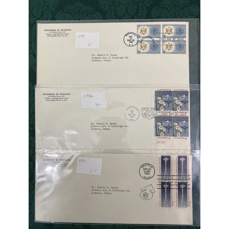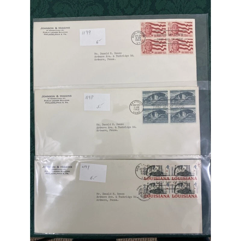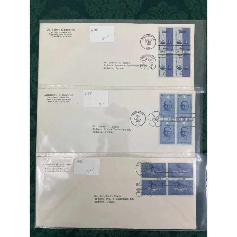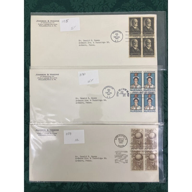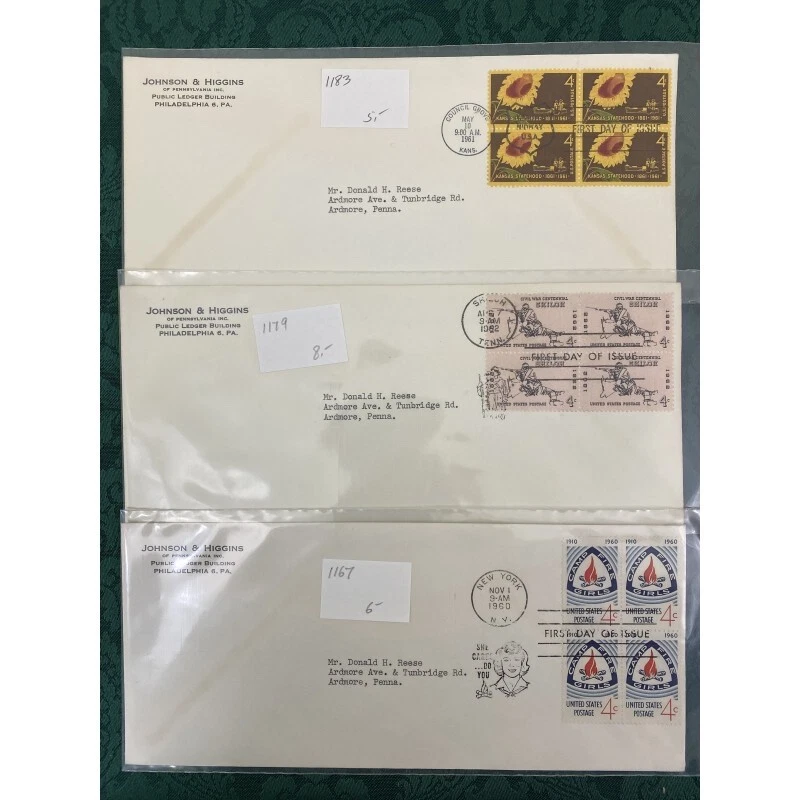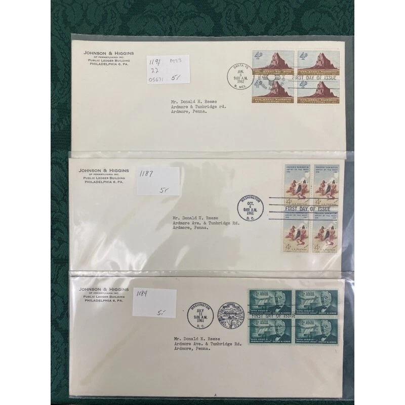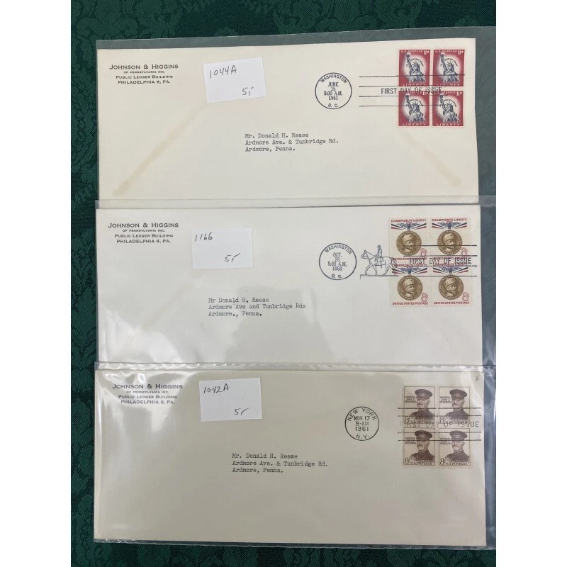Collection of 22 Johnson & Higgins of PA cachet First Day covers on #10 envelope including Civil War, China, Basketball and more