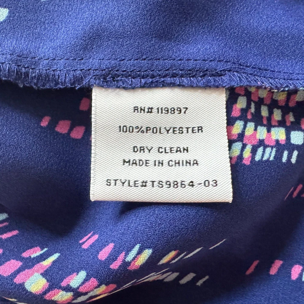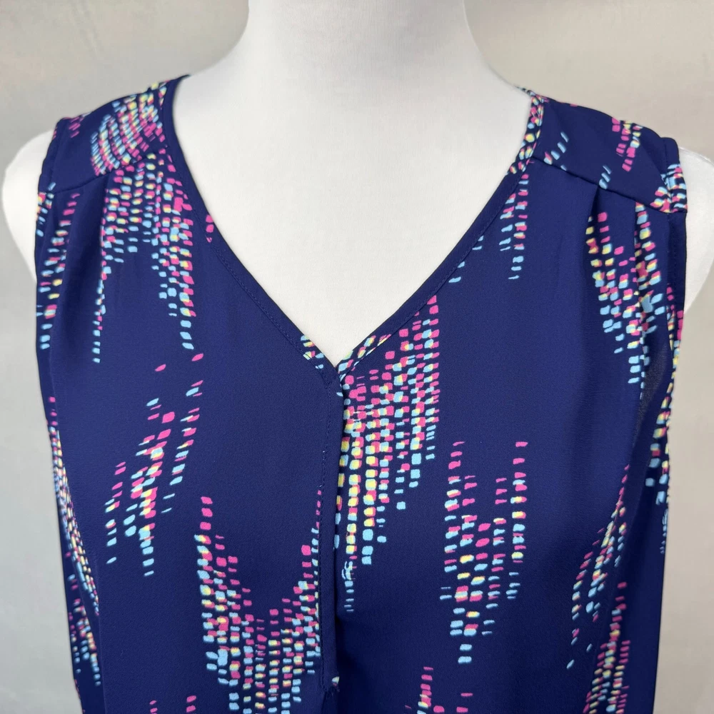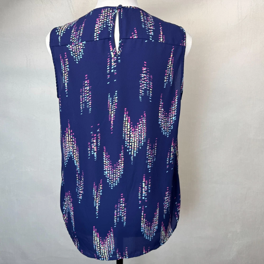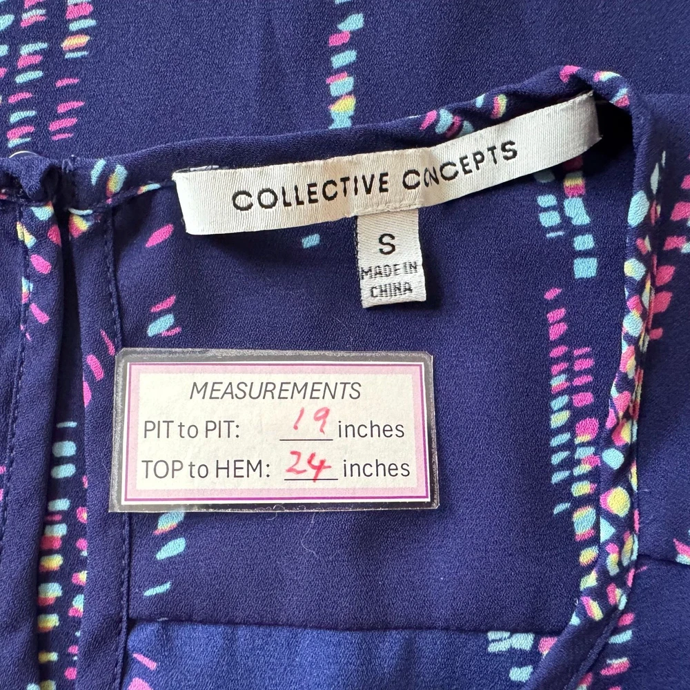 Elevate your wardrobe with this stunning Collective Concepts blouse in a beautiful blue hue. The sleeveless top features a V-neckline and a button closure, making it perfect for any occasion, be it a wedding, party, or casual outing. The blouse is made of high-quality polyester material and has a semi-sheer design that adds a touch of elegance to the overall look. The blouse comes in a regular fit, size S, and is suitable for summer, fall, or spring. The geometric pattern adds a unique touch to the blouse, making it a must-have for any fashion-forward woman. The garment care instructions recommend dry cleaning only. This blouse is perfect for women who want to add a basic yet stylish piece to their wardrobe. Measurements, Materials and Item Care: See labels photos. Item has been washed/cleaned and it is already packed, I will ship the same day or next business day. Color might differ from picture due to flashlight used , also it depends on your monitor light settings. Open to offers. B-1783