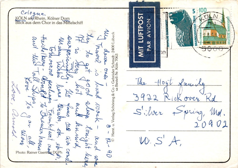 The postcard features a view from the choir into the nave of the Cologne Cathedral, known as Kölner Dom, located in Cologne, Germany. The message on the postcard is dated December 8, 1990, and talks about the hot and humid weather in Cologne, with a mention of Turks, Arabs, and other nationalities present in the area.