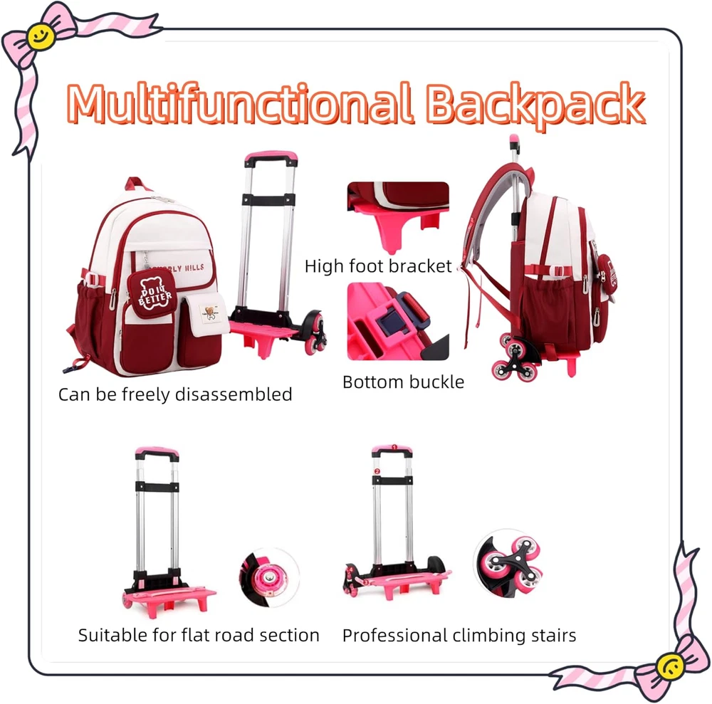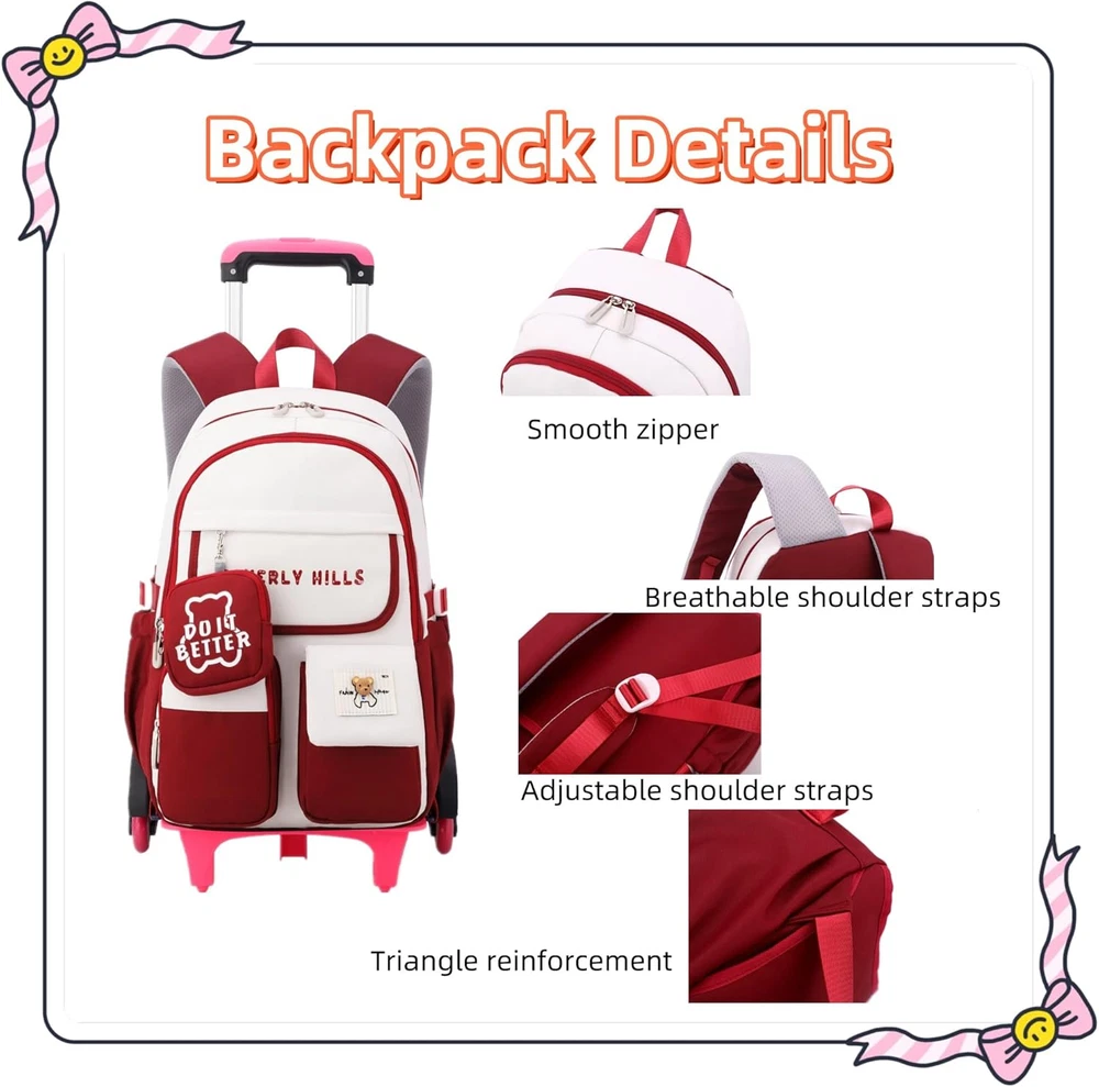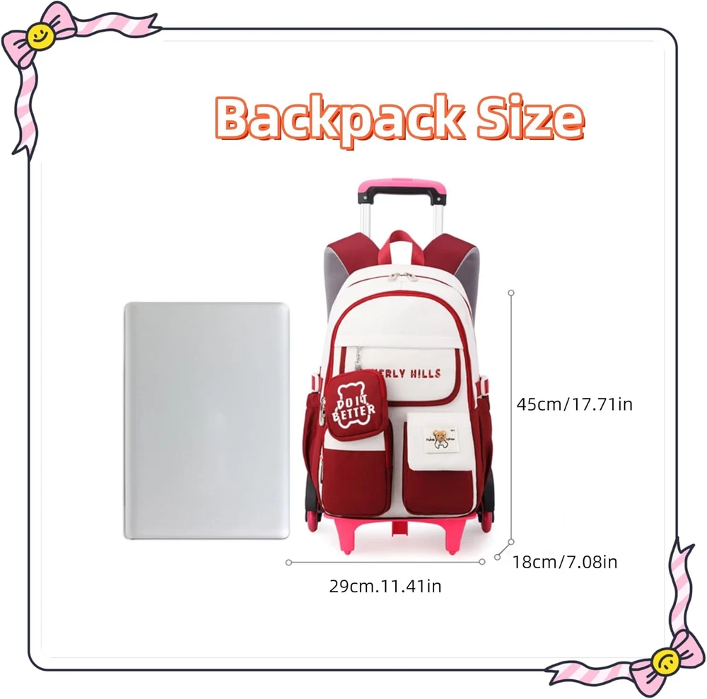 Color-blocking Girls Rolling backpack size:29(L)*18(W)*45cm(H); 11.41(L)*7.08(W)*17.71(H) inches,Package includes:1 * Backpack, 1 * trolley only Trolley Bookbag Large Capacity:1 large main pocket, 1 secondary pocket,3 front pockets can hold small items,1 velcro front pocket,2 Side pockets with adjustable buckle.Your child will definitely love the scientifically reasonable pocket and compartment design. Removable Roller Backpack Set:The Trolley School Bag can be a trolley or just an ordinary backpack. If your child doesn't want a trolley, just remove the rolling platform and it becomes an ordinary school bag.Two wheels Suitable for flat roads, six wheels can climb stairs,Aluminum alloy trolley has three layers of height can be adjusted according to the height of the child. Perfect Comfortable Backpack: This school bags boys made of water-resistant,tear-resistant nylon fabrics,helping to protecting your kid's belongings against rain drops in rainy days. The rolling bookbag has double zippers, smooth and non-snagging. The rolling backpack is ergonomically designed,Padded back panel much closer to body,very comfortable, Backpack is your best choice. Suitable for various occasions:The large capacity girls rolling backpack with wheels, easy to transport and carry.The bookbag has multiple colors to choose, and suitable for a wide range of people. The school backpack is a "must-have" for back-to-school season and good Christmas Day, New Years Day,Halloween or Birthday gift.If you have any questions, please feel free to contact us. Product Description rolling school bag for kids The video showcases the product in use. The video guides you through product setup. The video compares multiple products. The video shows the product being unpacked. Girls rolling backpack 2 Wheels &6 Wheels Rolling Backpack Large Capacity Rolling Backpack for Girls School Bag with Wheels Perfect Gift More Rolling Backpacks to Choose Add to Cart Add to Cart Add to Cart Add to Cart Add to Cart Add to Cart Customer Reviews 4.2 out of 5 stars 213 4.3 out of 5 stars 54 4.9 out of 5 stars 19 4.7 out of 5 stars 65 4.9 out of 5 stars 19 4.3 out of 5 stars 127 4.3 out of 5 stars 54 Price $39.99 $ 39 . 99 $39.99 $ 39 . 99 $42.99 $ 42 . 99 $20.77 $ 20 . 77 $42.99 $ 42 . 99 — $39.99 $ 39 . 99 Backpack Size 12.6(L)*9.4(W)*18.1(H) inches 12.2(L)*7.4(W)*18.89(H) inches 11.4(L)*7.08(W)*17.7(H) inches 12.99 L*7.48 W*18.5 H inches 11.4(L)*7.08(W)*17.7(H) inches 17.71H*12.59L*7.87W inches 17.71H*13.77L*5.11W inches For the crowd Girls & Boys Girls & Boys Girls & Boys Boys Girls & Boys Girls & Boys Girls & Boys Reflective strip ✘ ✘ ✘ ✘ ✘ ✘ ✘ Elementary ✔ ✔ ✔ ✔ ✔ ✔ ✔ Backpack set ✘ ✘ ✘ ✘ ✘ ✔ ✘