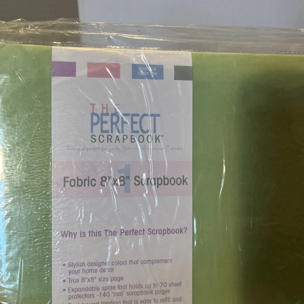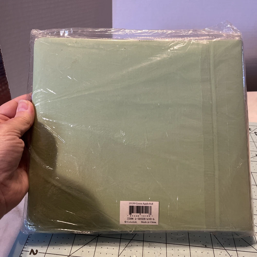 This is a Colorbok postbound scrapbook album in green apple cloth, sized 8" x 8". The album is acid-free and comes sealed. It is designed for scrapbooking with a solid pattern and a theme suitable for preserving memories. The unit quantity is 1, and it is made in China.