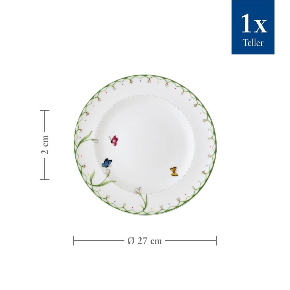 Charming dinner plate with spring-like decor for stylish serving at any occasion, also ideal as an original gift For serving main courses, cakes or desserts, Wide rim for clean serving, Perfectly combinable with Colourful Spring tableware Also suitable for gastronomy thanks to its handy shape, stackable inside each other, shock- and impact-resistant edges, optimum size for the dishwasher Dishwasher safe, microwave safe, high quality: Premium porcelain made in Germany Scope of supply: 1x Colourful Spring dinner plate (27 cm), Material: Premium porcelain, Colour: White/Coloured