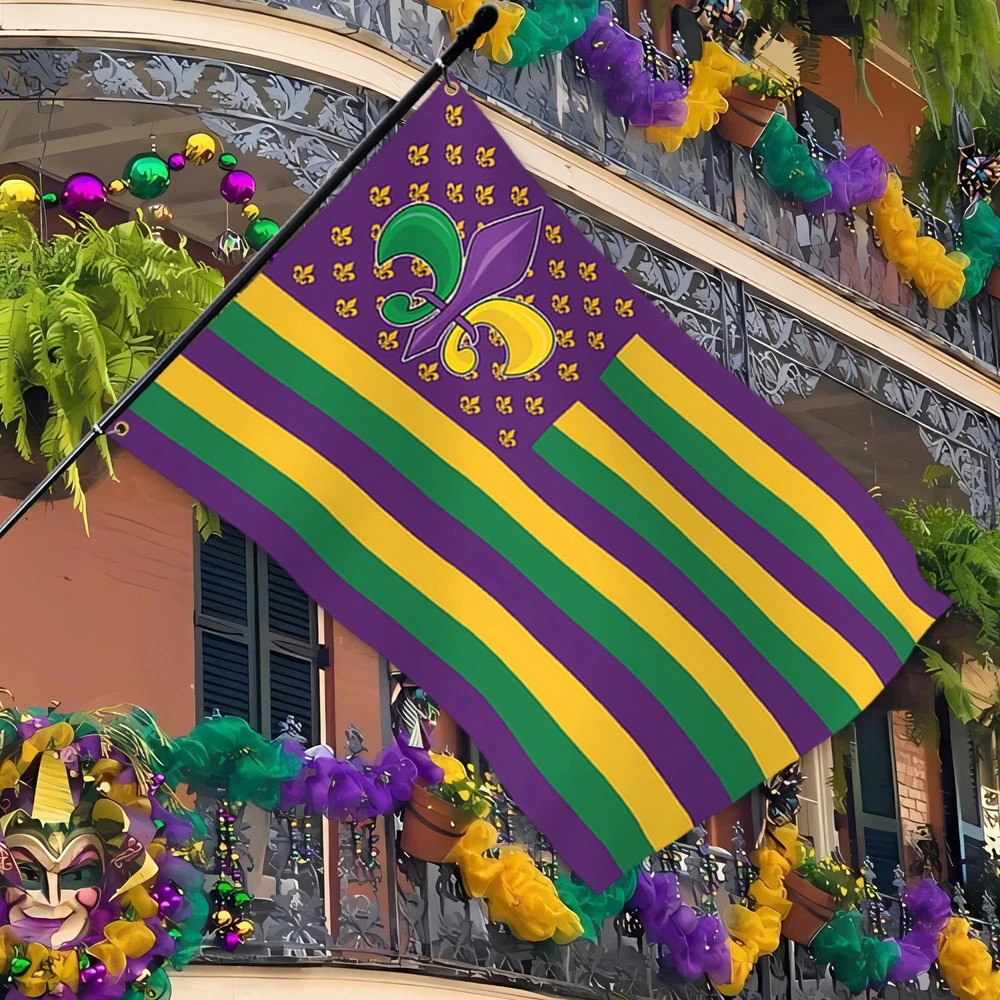 1 Show: Express the joyful atmosphere of masquerade carnival of the with this stunning mardi gras flag With On It with an eye-catching design. Durable: This mardi gras banner decor flag 3x5ft outdoor use polyester flag stands out because of its double-sided mirror printing, strong material and waterproof and UV-resistant coating, long-term use will not cause the flag to fade, and its ability to withstand strong wind and rain. Multi-Functional: Whether you are hanging the mardi gras house flag 3x5 outdoor is double sided on your wall, waving it during a parade, displaying it in your house/yard, or using the mardi gras flag as a unique holiday gift, this masquerade carnival fat tuesday party decor is perfect for anyone occasion. Symbolic And Inspirational: The combination of the mardi gras banner and the American flag creates a powerful visual statement. Also a for mardi gras garden flag is the best choice for outdoor garden decoration on mardi gras party, dance party, party or any other day you want to celebrate American. Easy To Install: With brass grommets, you can set up this mardi gras banner flag for home on any flagpole in seconds, and its vibrant colors stay vibrant for a long time. (Please Note: Flagpole not included).