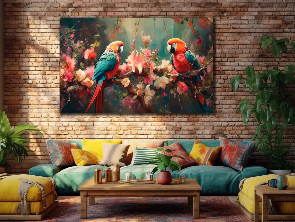 Colorful Art Parrots with Pink Blossom Unframed Canvas Print Australian Wall Art