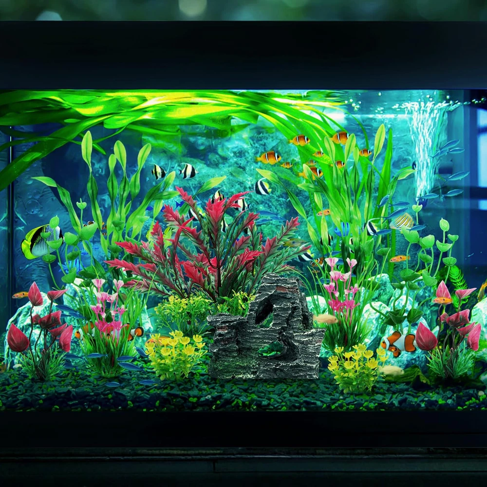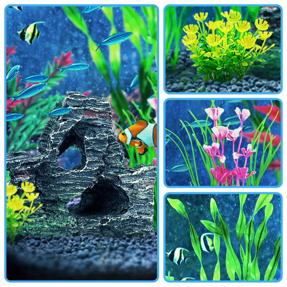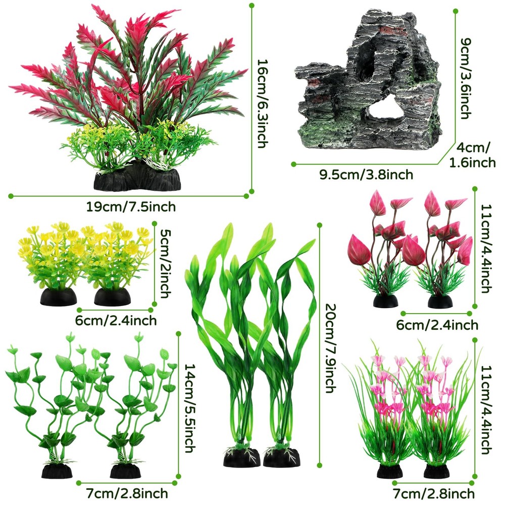 Fish Tank Accessories Aquarium Plants, 12pcs Colorful Fish Tank Artificial Plants and Cave Rock Decor Set, Aquarium Decorations Plants Decorate your aquarium all the time without pruning Great for fish tank decorations, look natural in aquarium Low maintenance, could be used for a long time The roots of the artificial aquarium plants are detachable, easy to disassemble for easy cleaning. Aquarium Plants Color: Green, red and orange (As the pictures shown) Quantity: 11 Pieces Size: 2 inch ~ 7.9 inch --- With different styles and sizes, you can decorate you fish tank according to your creativity and imagination. Fish Tank Rockery view Material: Resin Size: app.10cmx11cmx8.5cm/4''x4.4''x3.4'' color: As the pictures shown Quantity: 1 Pcs --- Make your aquarium vividly ,add to natural color. --- Fish can hide and Pass through the hole and crannies within. Notes: 1. These plants may be deformed during packaging and transportation, and can be reduced by soaking in 40-60 degrees water. 2.Since it is a new product, there will be a slight smell. After washing with warm water and ventilation, the smell will disappear quickly. Fish Tank Accessories includes: 1 Resin Cave Rock Decoration , 2 short Aquarium Decorations Plants, 6 medium aquarium plants and 3 tall aquarium Decor plants. Heights vary from 2 inches to 8 inches. It is suitable for 5 gallon or larger fish tanks. This rocks are made of resin, non-toxic and safe. The Fish Tank Artificial Plants are made of soft and healthy material, no harm to water and fish. It is ideal for both fresh and salt water, do not affect the PH in the tank. All Aquarium plants with pedestal: every fish tank plants in this set has a pedestal at the bottom, heavy and firm, and with the pedestal, those plants will not float around in the aquarium. Soft leaves allow your fish to shuttle and hide in the water plants, which won't hurt your fish or other pets, will provide a comfortable and clean living environment for them. Our fish tank decorations perfectly replicates the natural environment, and once you put it in the tank, you won't even be able to recognize that it's actually made of plastic. Your fish will enjoy the environment these plants provide,and they can play and hide in it.