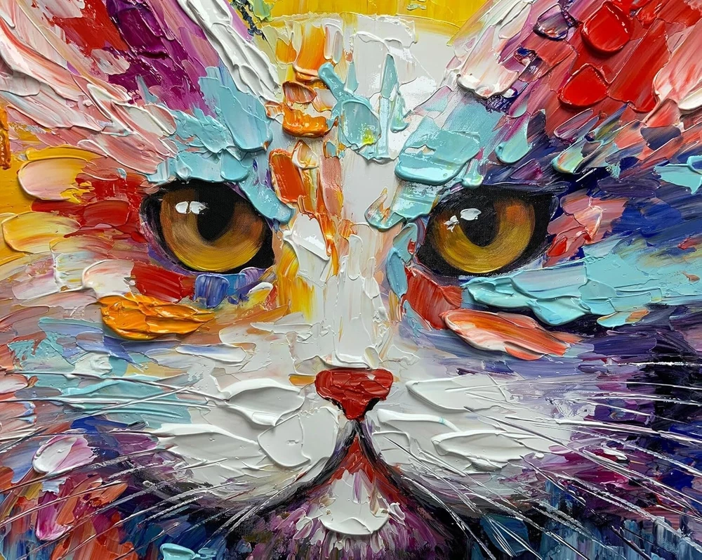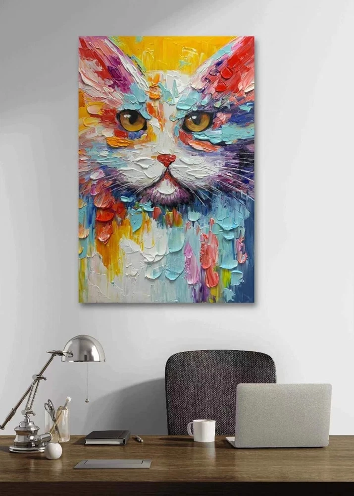 Add a touch of art to your space with this colorful and unique hand-drawn oil painting decoration mural hanging painting. The abstract landscape features a cute cat and is produced using the oil painting technique. The painting is unframed and sold as a single piece. It is a perfect addition to any art lover's collection and is produced in China in 2023. The painting is handmade and features a miniature style. Get your hands on this one-of-a-kind piece today!