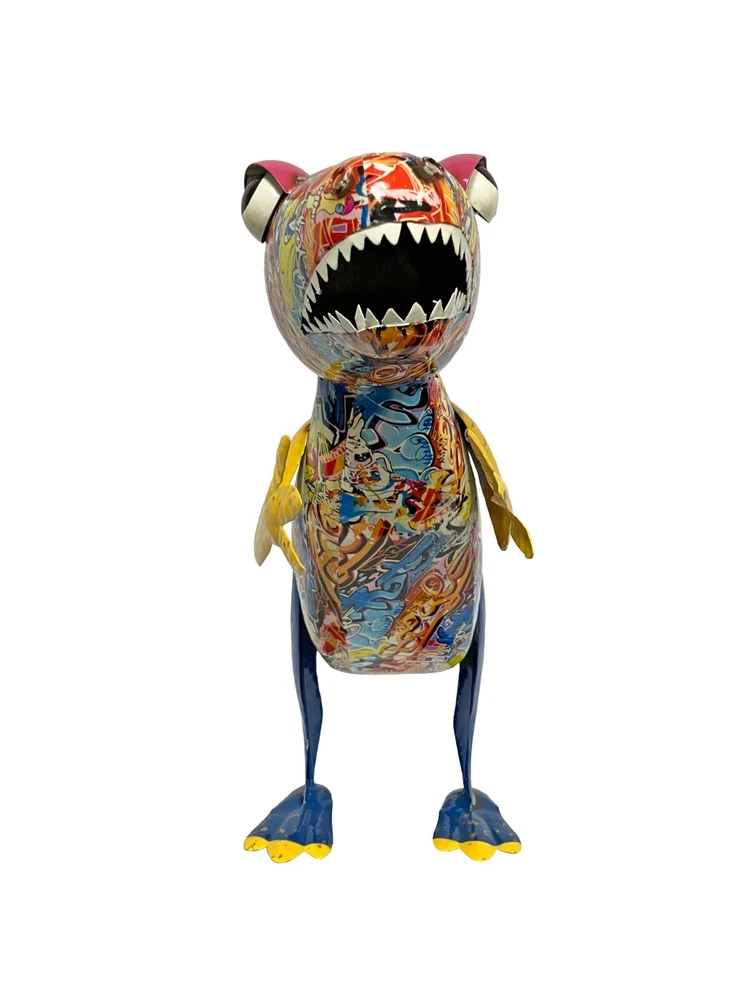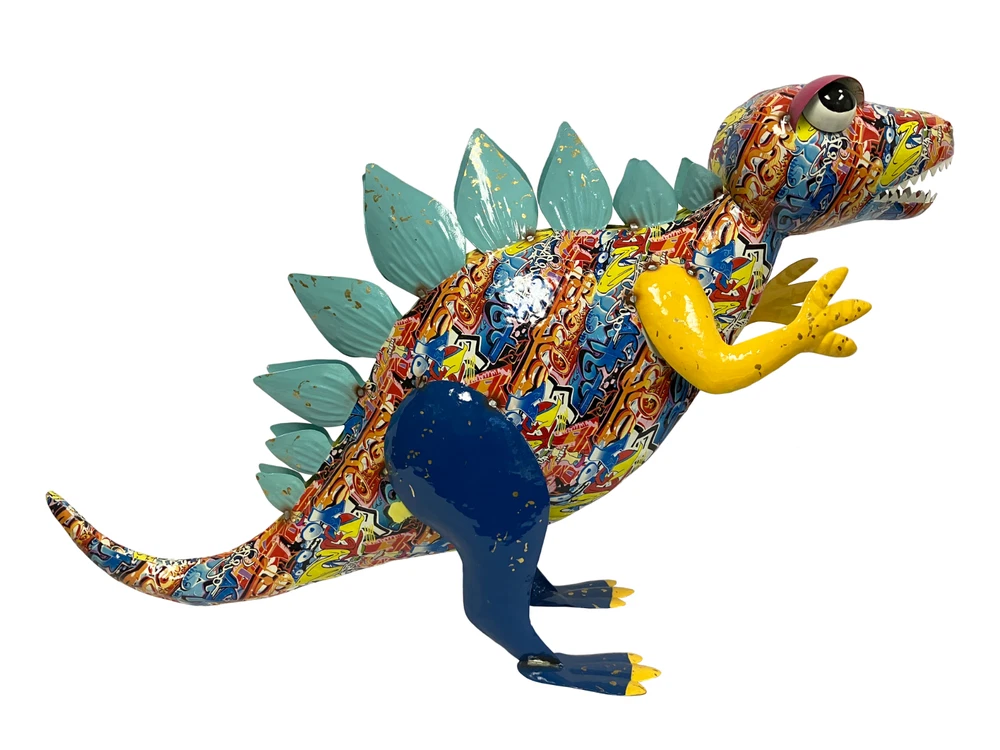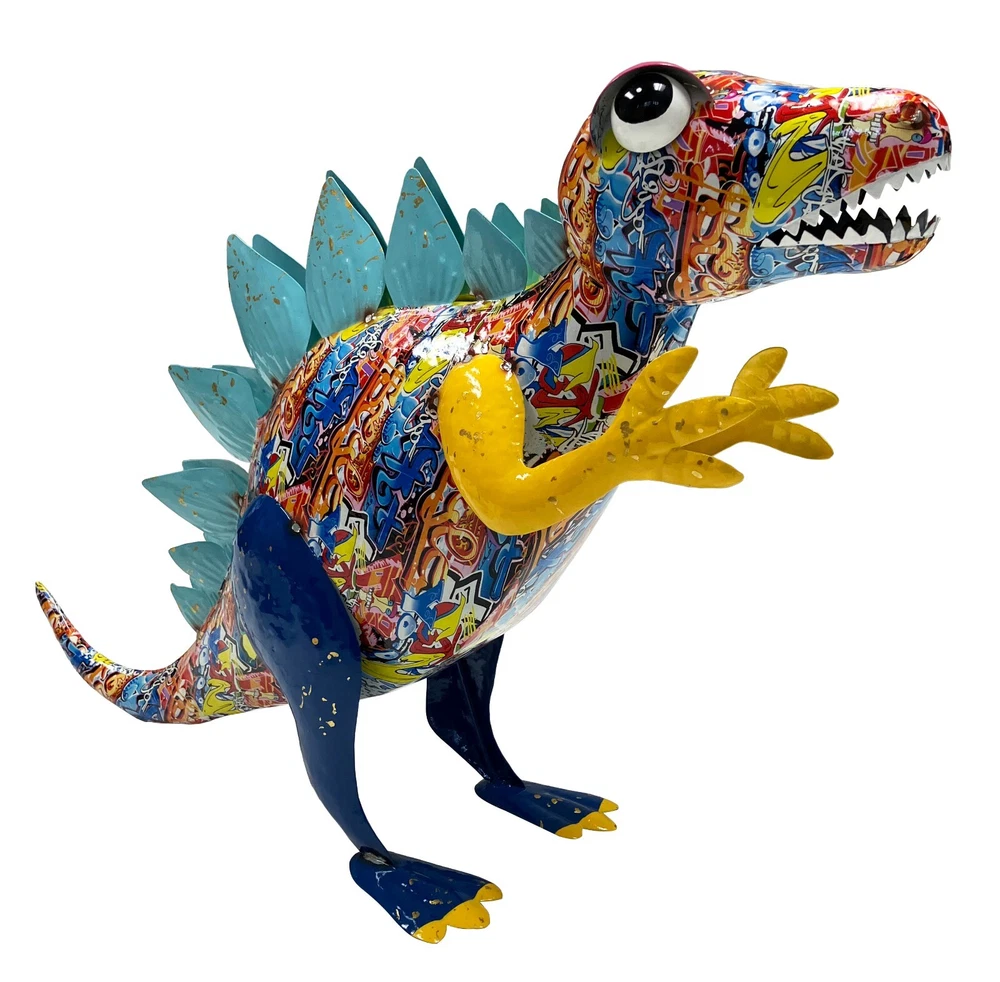 Add a touch of prehistoric charm to your indoor or outdoor space with this colorful metal statue of a Stegosaurus dinosaur. The abstract graffiti pattern adds a unique touch to the alligator-shaped statue, making it a perfect addition to any animal-themed décor. Measuring 21 inches in length, 14 inches in height, and 8 inches in width, this small statue is perfect for porches, flower beds, or lawns. Crafted by the Continental Art Center, this statue features enameled detailing and a glossy finish. The multicolor design adds a playful touch to the dinosaur's appearance, making it a great conversation starter. Whether you're a fan of dinosaurs or simply looking for a unique piece of art, this Stegosaurus statue is a great choice.