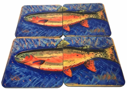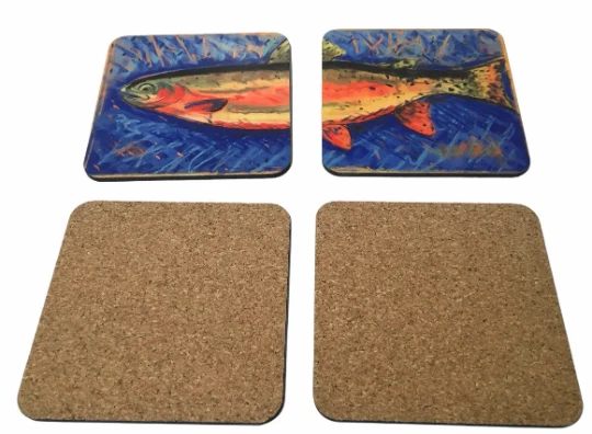 Beautiful 4 piece hardboard coaster set, brown kraft box with window 3.75" X 3.75" rounded corners with cork backing. Made in the USA