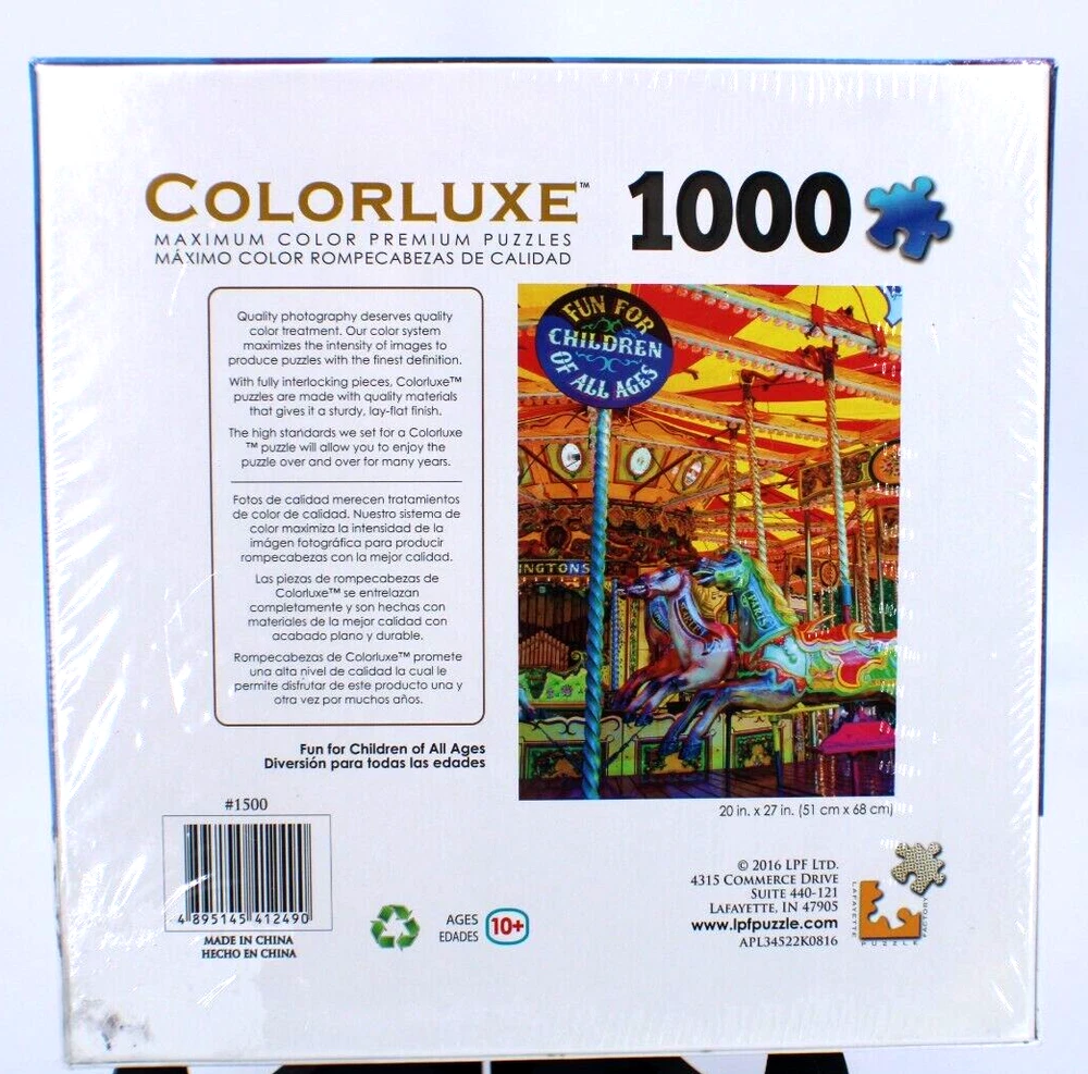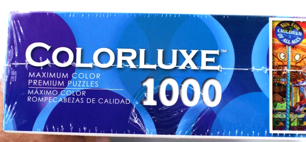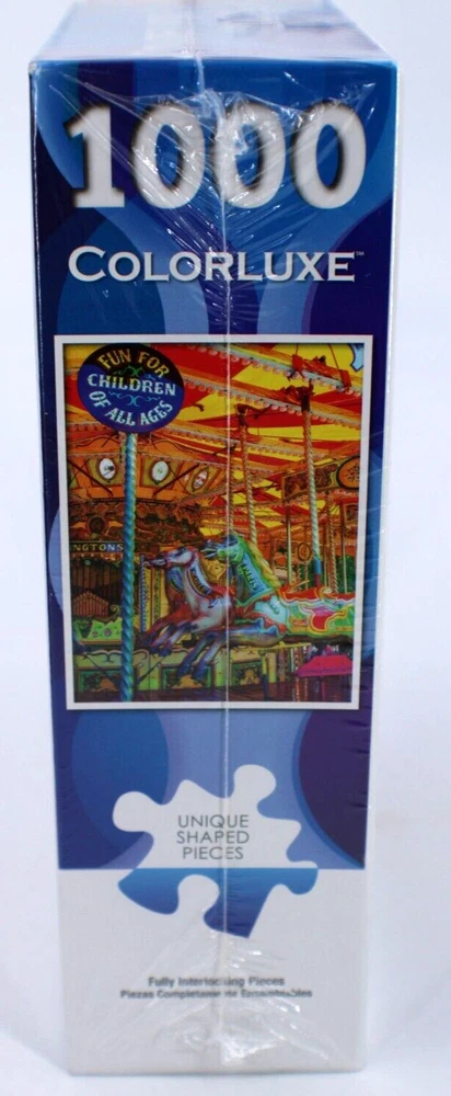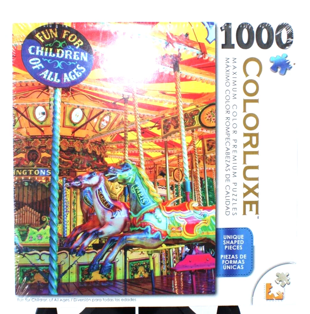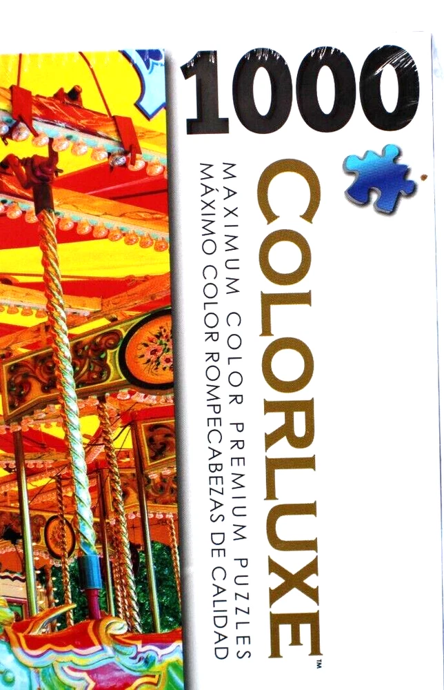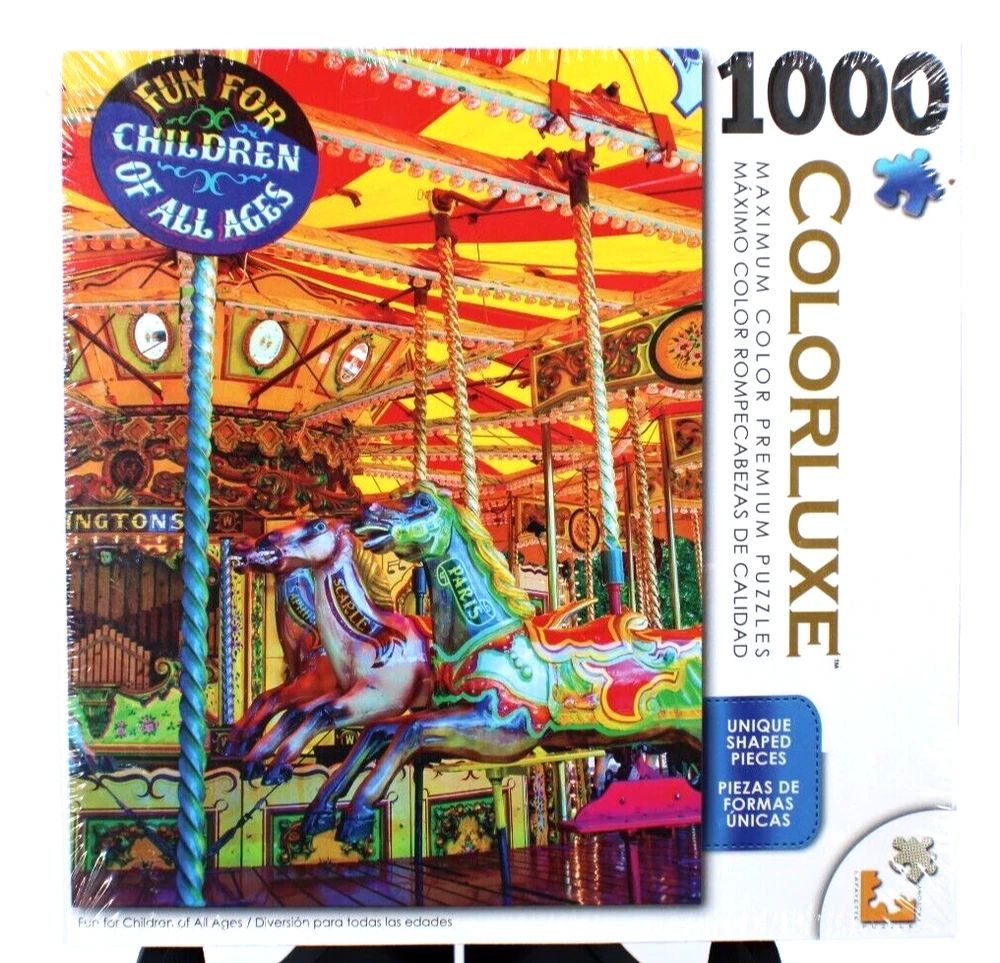 Colorluxe Carousel Multicolor 1000 Piece Quality Jigsaw Puzzle 20" x 27" Sealed Enjoy the colorful charm of this 1000 piece Jigsaw Puzzle. Still sealed and brand new, this 20" x 27" puzzle will provide hours of entertainment. Perfect for puzzle lovers or a thoughtful gift Small tear in plastic in rear lower corner but still factory sealed See photos for details