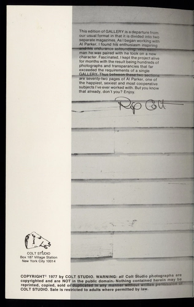 DETAILS: Gallery #15 featuring Al Parker by Jim French / Colt Studios, NYC, 1977. Among the harder to find Colt titles. Rare. Measures 5.5" x 8.5" inches. Please see images for further details. Oxxbridge Galleries Established 1987 Oxxbridge Galleries was founded in 1987 and specializes in vintage LGBT paper items. We carry among the largest selection of fine art gay photographs, magazines and collectibles available anywhere on line. We invite everyone to visit our store and view our entire inventory.