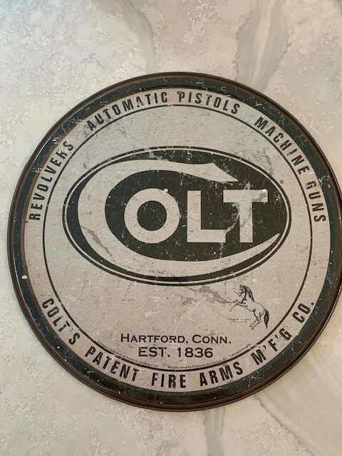 This Colt Firearms aluminum sign is a perfect addition for any gun enthusiast's collection. The sign, made of high-quality tin, features the iconic Colt logo and is a great way to show off your love for firearms. This reproduction sign is a perfect conversation starter and is sure to impress any guest.The sign is made in the United States and is an original reproduction of the classic Colt Firearms sign. It is perfect for display in a man cave, garage, or any other space where it can be admired. This sign is a must-have for any Colt Firearms fan and is a great way to show off your love for the brand.