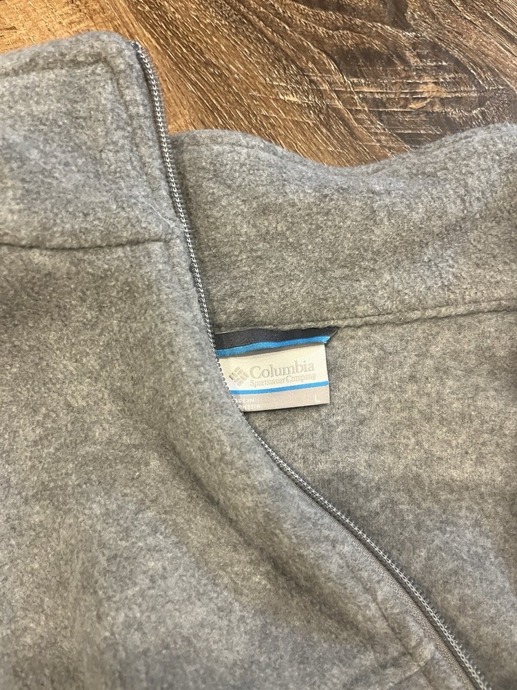 Full zip Columbia large fleece jacket. Gray and considered a men’s jacket. Great for layering as needed.