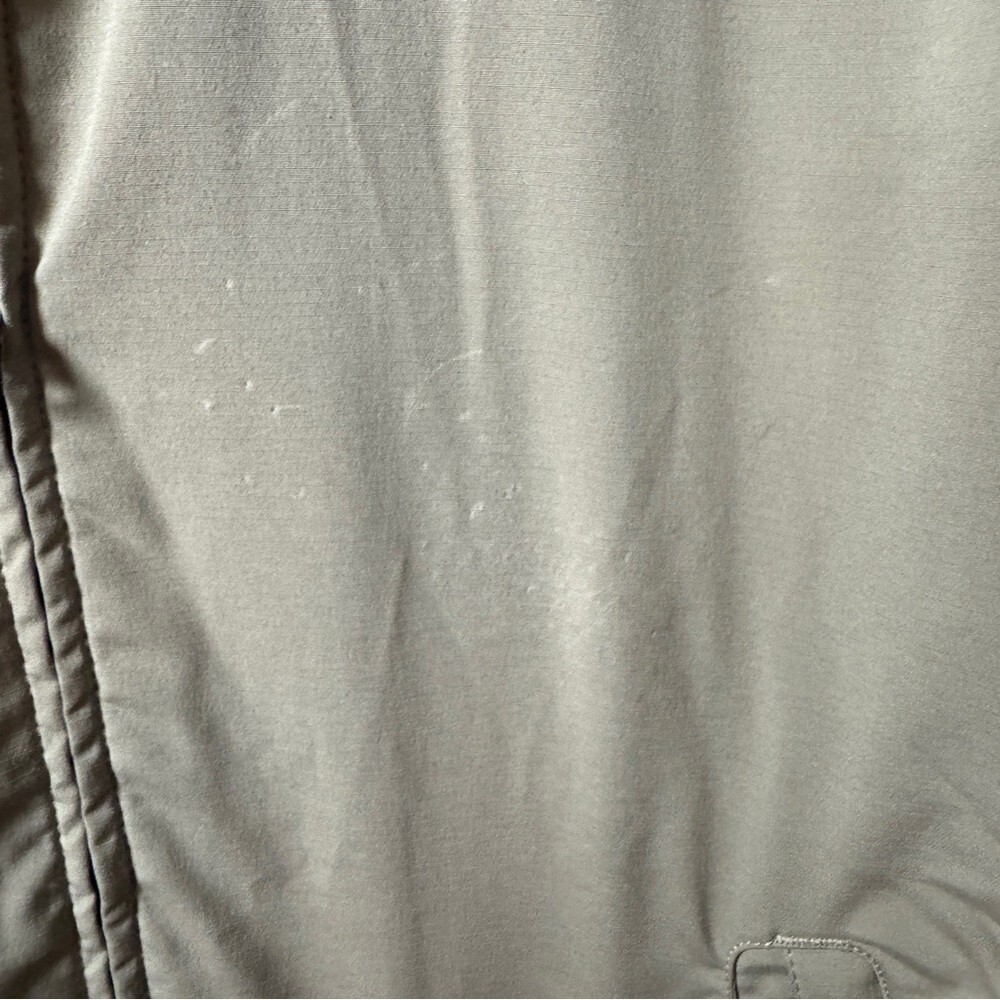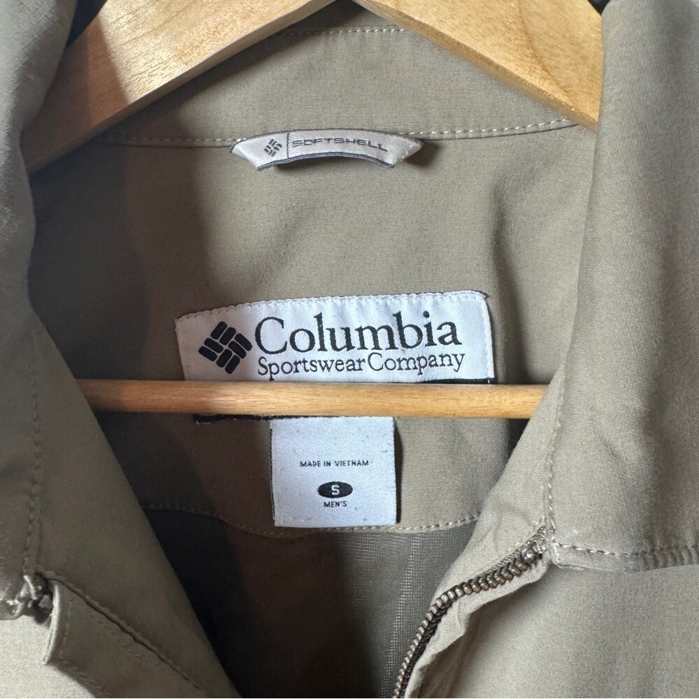 Columbia light jacket men’s S khaki Columbia lightweight taupe jacket in size small. Super minimal and perfect for layering. Zip up with side pockets and snap sleeves. Has a couple light spots on front (see closeup). Great for spring or travel. #columbia #mensstyle #neutralwear #springlayer #windbreaker #vintagestyle
