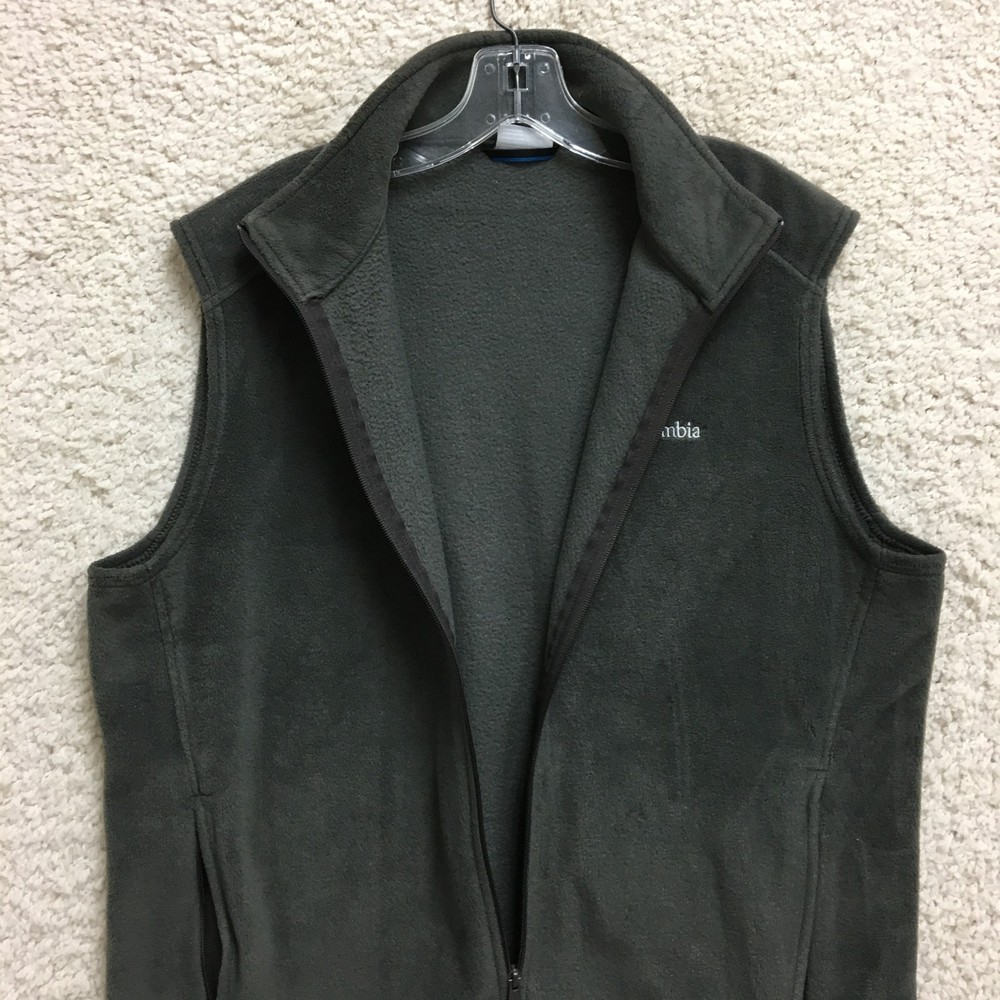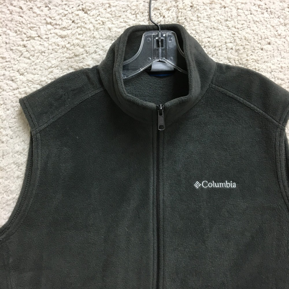 Columbia Vest Mens Large Gray Fleece Full Zip Outdoors Hiking Sleeveless Pockets Condition: Good used condition, shows light wear and some minor spots on back near hem (see photos) Soft midweight 100% polyester fleece provides warmth and comfort Features two zippered front hand pockets for secure storage Embroidered Columbia logo at left chest Full zip closure with stand collar for adjustable coverage Shell: 100% Polyester (see tag for care instructions) Tag Size: Large Approximate flat measurements: - Pit to pit: 24 inches - Length: 29.5 inches Color: Gray No major flaws, gently used and ready for your next hike or outdoor adventure Made in Bangladesh Inventory number: X1343